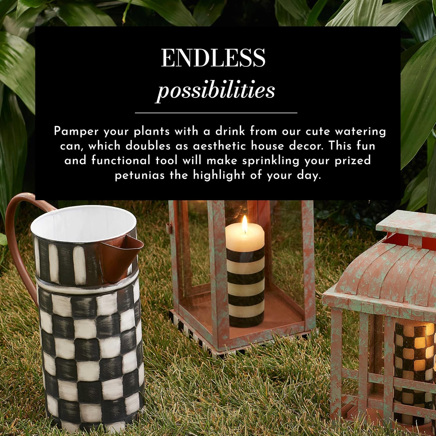 - ELEGANT OUTDOOR GARDENING TOOL: Our Check It Out rustic watering can features distressed black-and-white checks and stripes with a painted copper-finish handle and pour spout. The pattern creates vintage charm to complement a variety of decor.