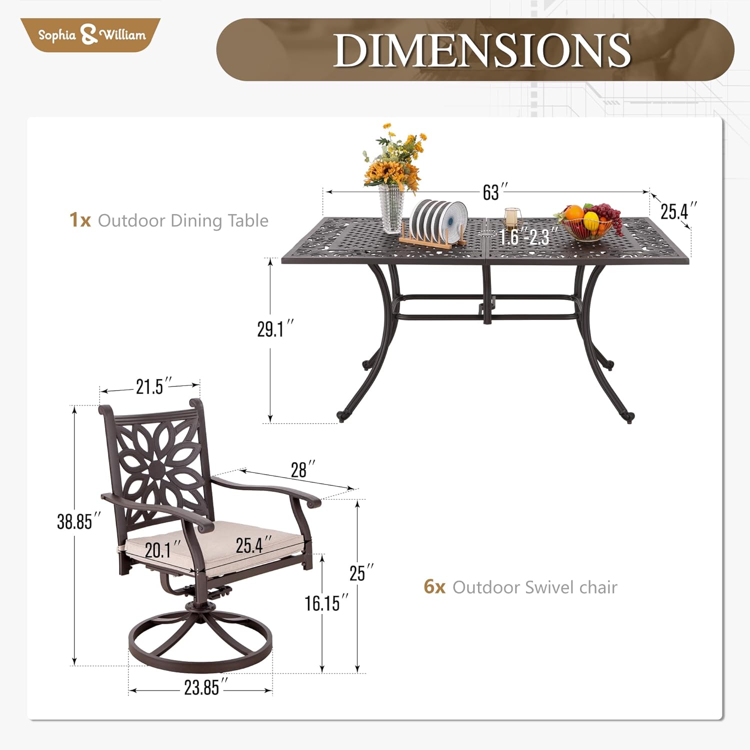 Sophia & William 7 Pieces Cast Aluminium Patio Dining Set for 6, Outdoor Swivel Rocking Chairs and Rectangular Table with 2.3" Umbrella Hole for Porch Backyard Deck, Bronze