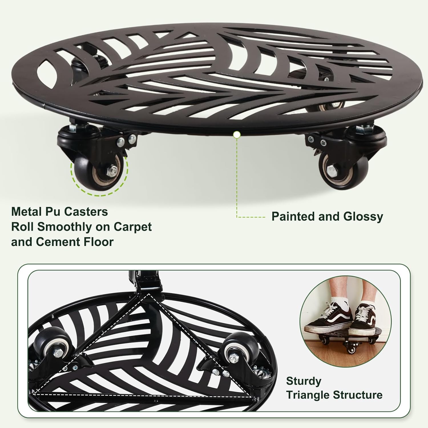 - Metal Construction & Super Strong Load Capacity: Four metal PU wheels for 13.6" large plant caddy and three PU metal wheels for 12" plant caddy; these wheels are well painted and anti-rust. They're made from heavy-duty iron materials and strong enough to load up to 260 lbs. You can roll large, heavy plant pots around the rooms and the outdoors for easy watering. Easily to roll out into the sunlight and back to protected space!