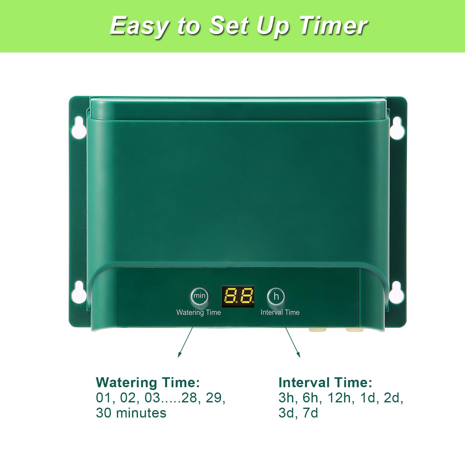 - 【Programmable Timer】--- Unit was easy to program. Just set the watering time (hit set) and the interval time (hit set) and away you go. The timer can be set at hour or day intervals. The automated watering schedule offers 30 modes of operation, with 1,2,3…29 30 minute waterings, every 3,6,12 hours or 1,2,3 7 days
