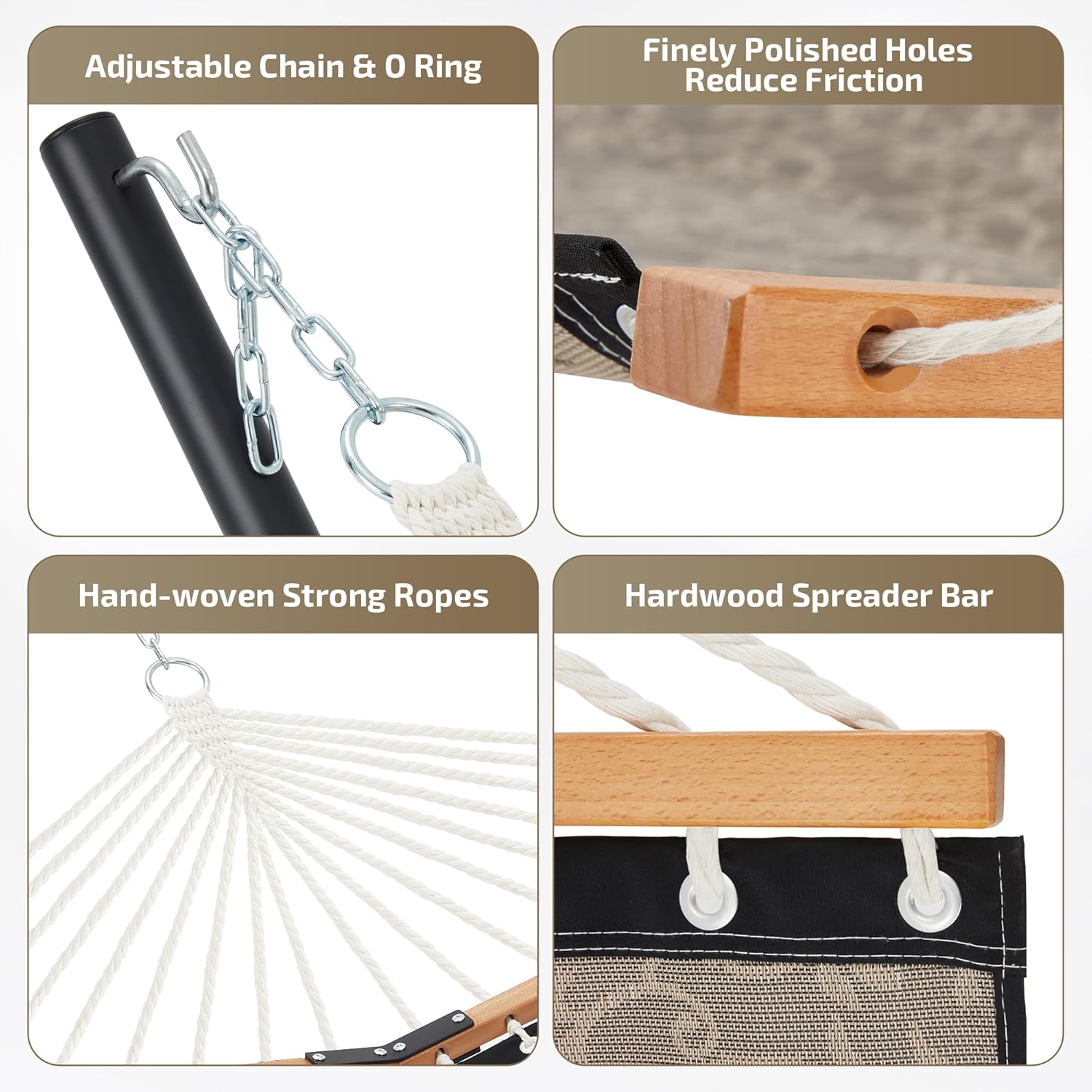 - ăCurved Spreader BarăThe angle of the curved bars make the center of gravity more stable when using. The countersunk spreader bar holes can reduce the friction between rope and wood which make the hammock stands the test of time.