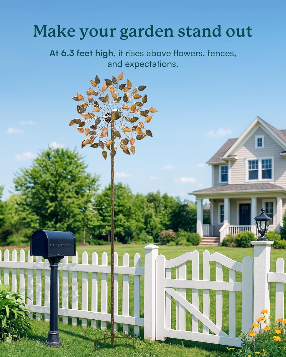 - BEAUTIFUL LEAVES DESIGN: This stunning metal yard spinners features a lovely copper finish and round design. Dual rotors spin independently and rotate 360 degrees. The kinetic yard wind spinners has thickened poles (diameter 22mm, 40% thicker than others) and stable metal stake with three prongs to ensure its firmly planted for windy days and against a snowy landscape.