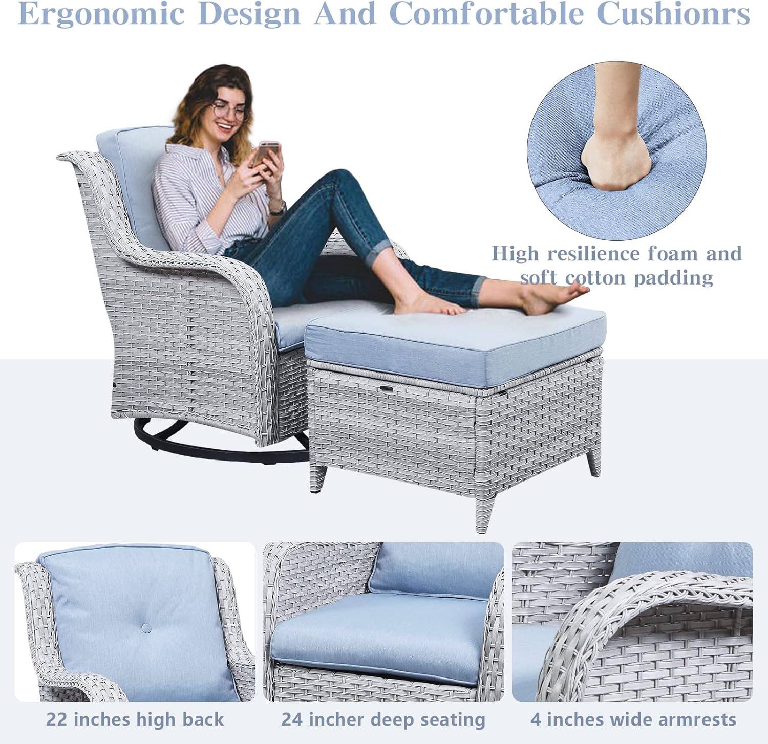 - Patio Furniture Set Introduction: The 5-piece patio furniture set includes 2 swivel glider chairs, 2 ottoman and a glass top side table, ottoman can not only be used to relax your legs, but also can be used as a small table or small stool. The swivel chairs can hold up to 350 pounds.