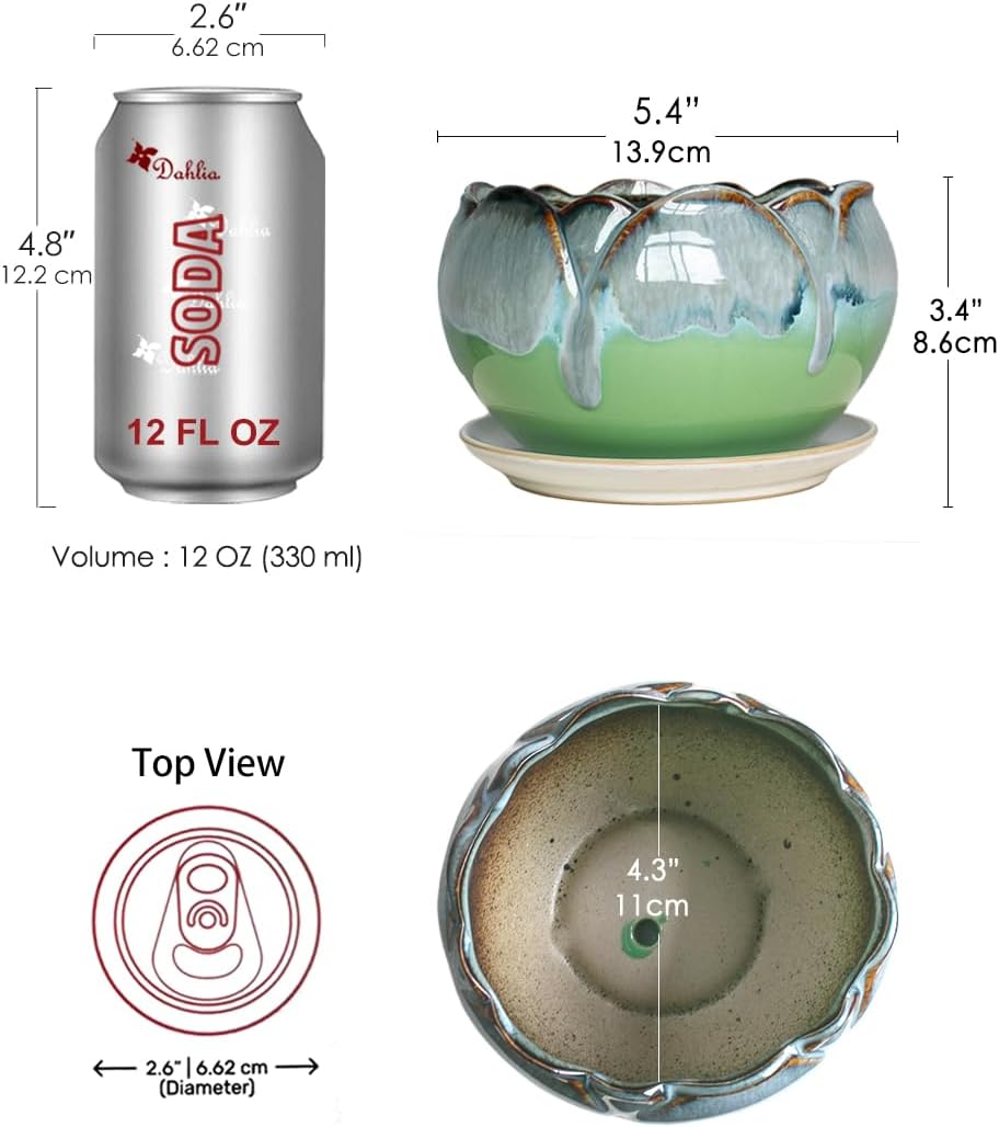Dahlia 5.5'' Inch Rustic Drip Glazed Ceramic Planter/Succulent Pot/Plant Pot w. Saucer/Tray, Green