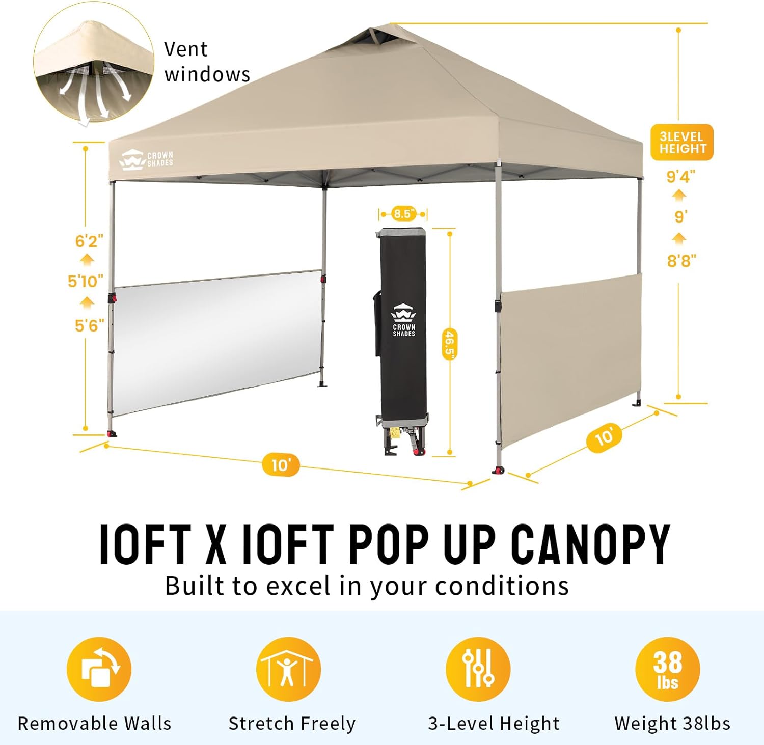CROWN SHADES 10x10 Pop up Canopy Tent Instant Canopy with 150D Silver Coated Fabric Including 2 Half Sidewalls, 4 Ropes, 8 Stakes, 4 Weight Bags, STO 'N Go Bag, Beige