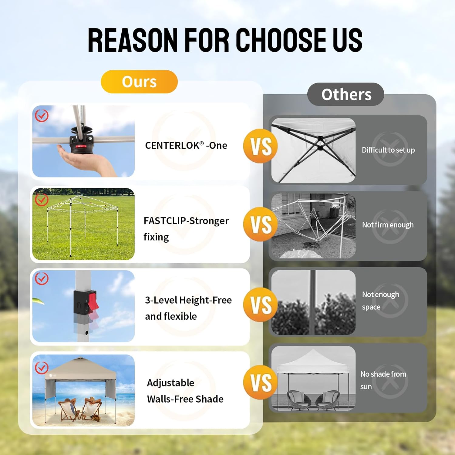 - [EASIEST SET UP]: Patented one push center lock technology โ central hub locks out all four legs with a single push. Then use the soft pinch-free buttons to set the leg height. Next generation canopy designed so two people can set it up in seconds with no tools necessary.