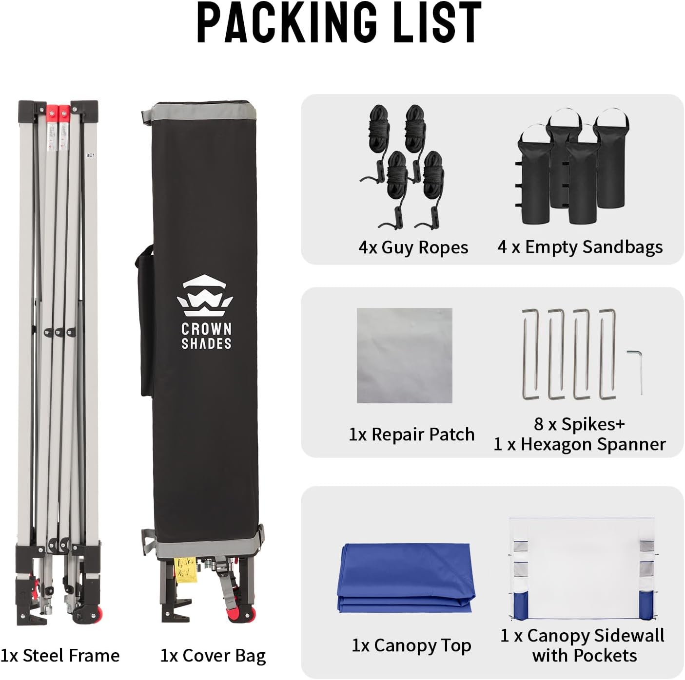 - FAST CLIP CANOPY FABRIC - The new clip system easily attaches the canopy fabric to the frame. The silver-coated interior provides UPF 50+ UV protection, ensuring cooler and safer shade. Made from rugged 150D fabric, the canopy is water-resistant and flame-resistant (CPAI-84). Integrated air vents and the EZ clip system prevent wind lift and rain pooling, reducing fabric tearing risks. A 150D sidewall with organizer pockets is included to block sunlight from the side, ideal for outdoor events.