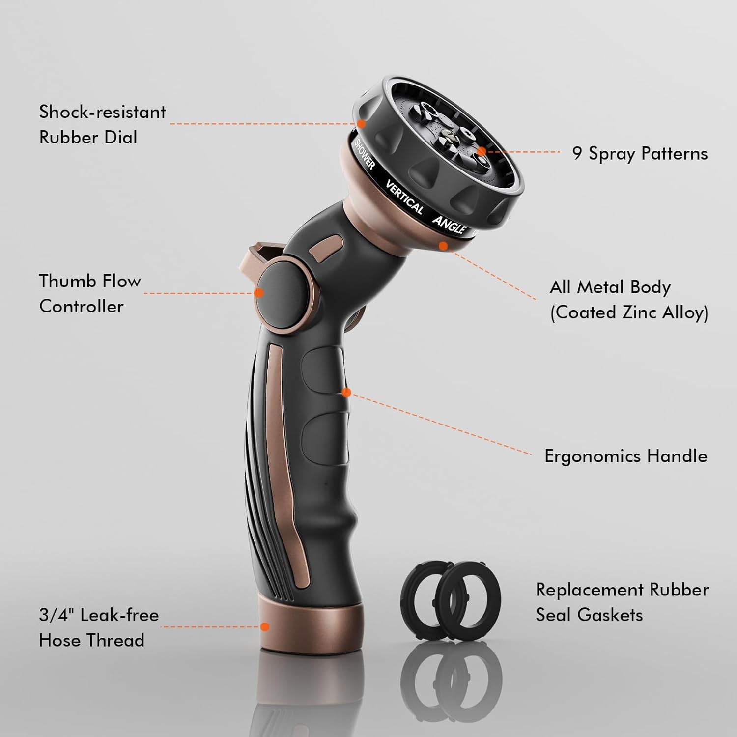 - ăHeavy Duty Metal Hose NozzleăConstructed with premium zinc-alloy material, this hose nozzle sprayer is solid & strong to resist daily drops and shocks. The bronze powder painting, TPU coating and rubberized bezel dial can enhance durability & flexibility and withstand hard impacts & heavy force. A long-lasting garden hose nozzle you can count on many years.