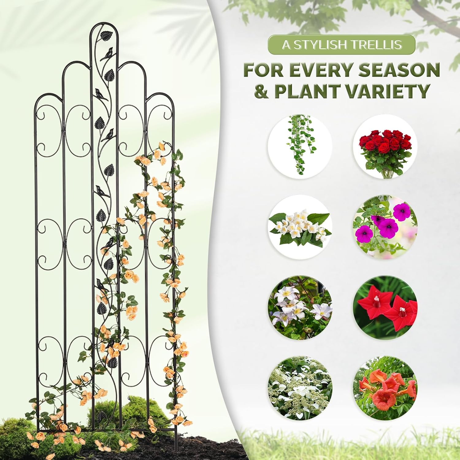 - π SUPPORT MULTIPLE CLIMBING PLANTS: Whether it's delicate vines, vibrant roses, or fragrant jasmine, our garden trellis can handle the weight and growth of various climbing flowers