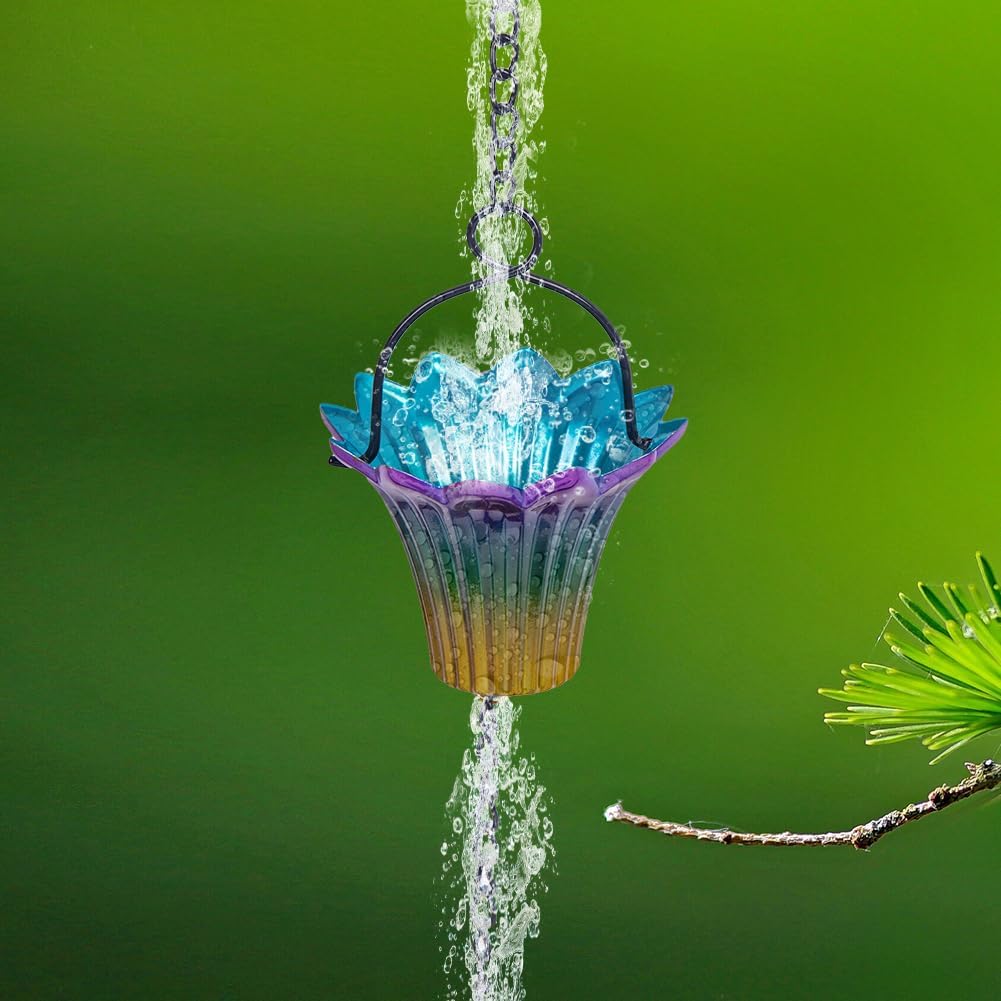 - Versatile Rainchain: The 10 Ft rain chain is composed of 12 colorful flower cups and is sized to fit standard single-story buildings. The unique design adds a chic touch to roofs and awning nests. It is an elegant alternative to traditional gutter downspouts