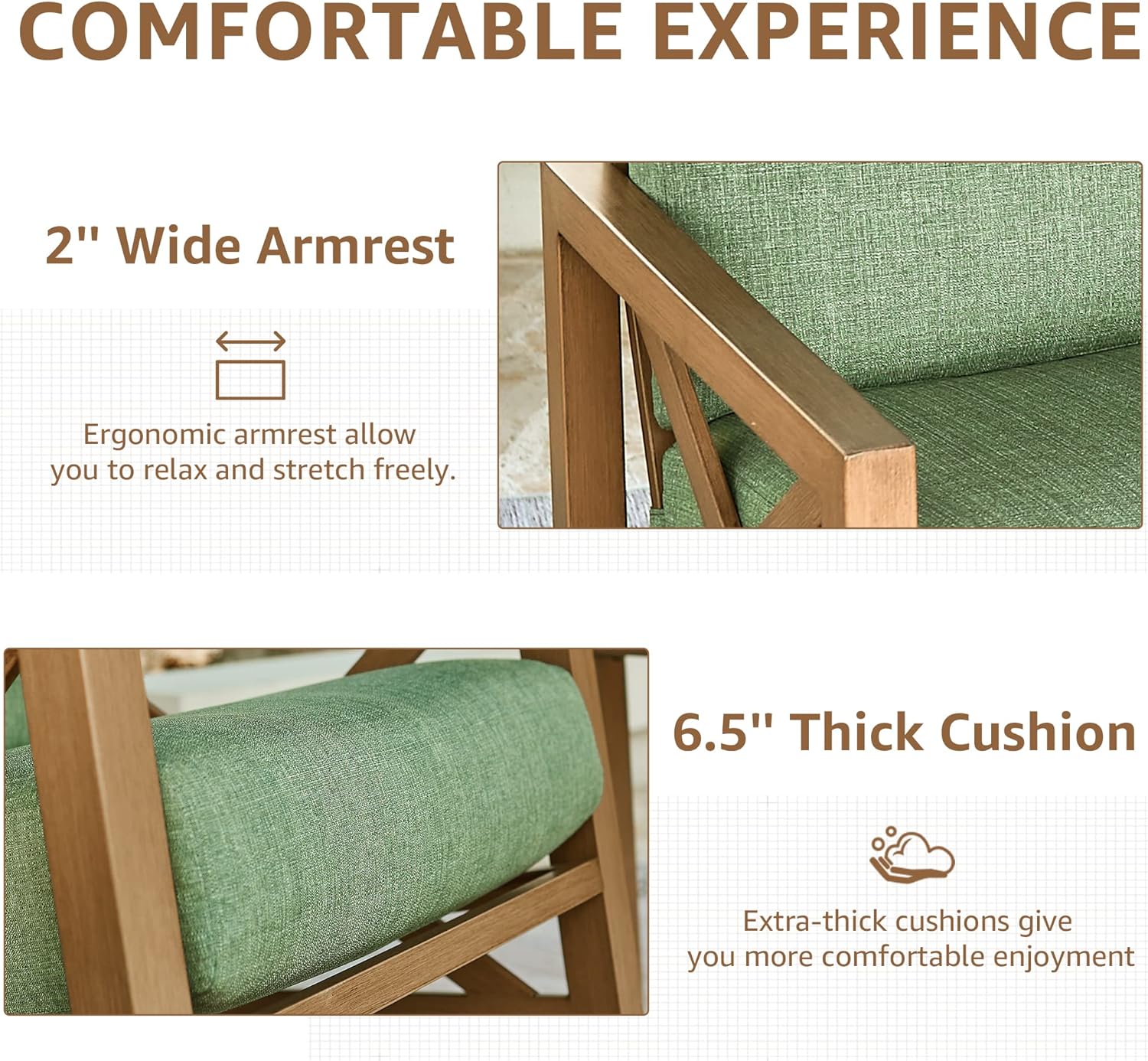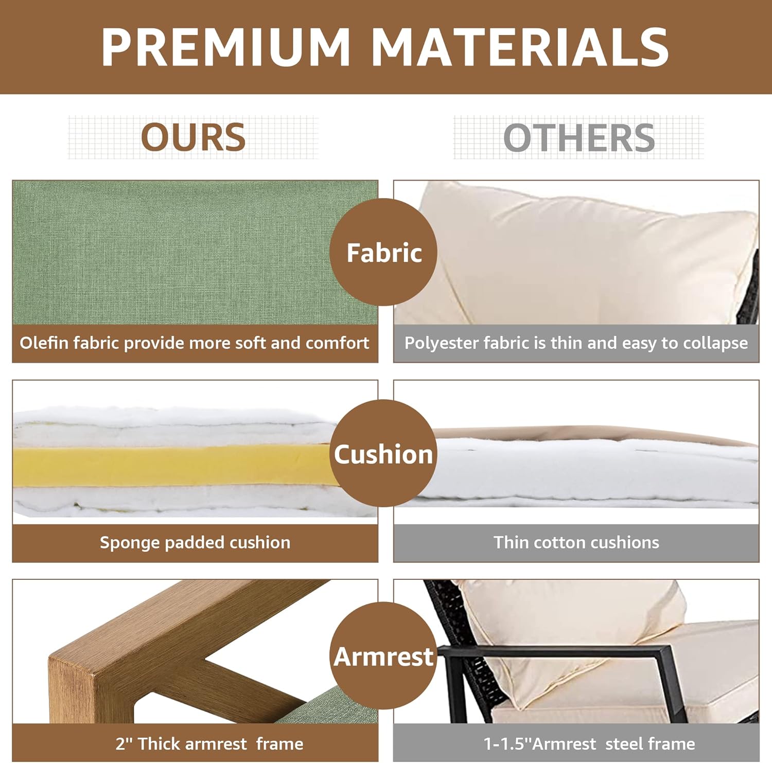 - Large Frame Size and Spacious Chairs:Chairs and tables are designed with thick and strong steel, and the width of the armrest pipe is 2 inches provide enough room to seat comfortably. Our thick olefin cushions are all made of high desity sponge with 6.5 inches ,which is more breathable for your comfort. This outdoor furniture set can be used in the courtyard, backyard, porch, garden, poolside, balcony.