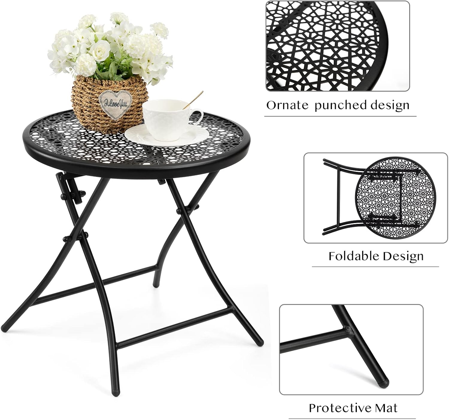 - High Quality: The small folding table is made of high-quality metal. A special technology makes the patio side table UV protected and rust-resistant. The metal material and the crossed legs makes this table sturdy to hold up plants or heavy objects