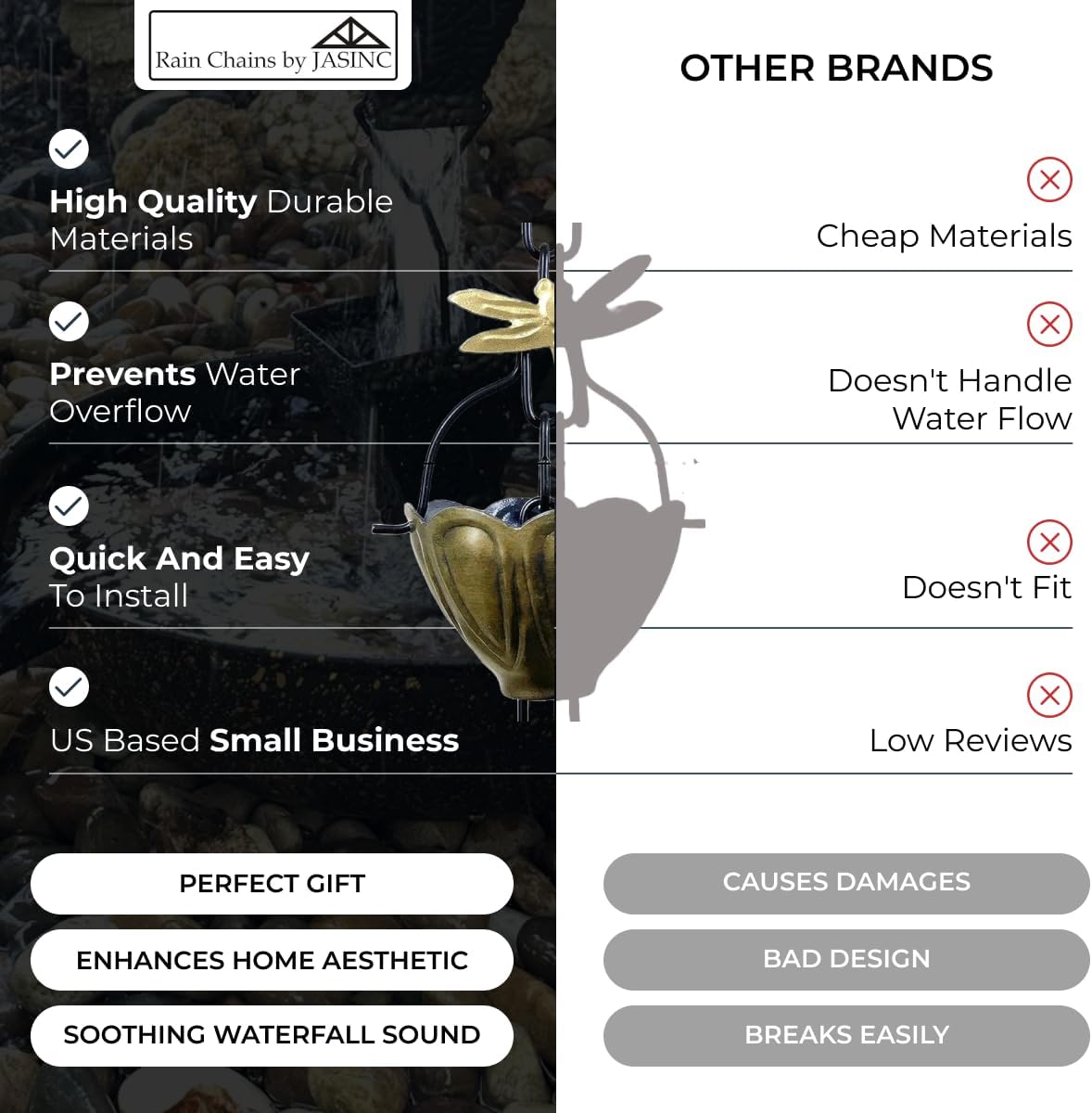 - RAIN CHAINS BY JASINC QUALITY ASSURANCE: we use only top quality materials for all our rain chains and accessories. We focuses on preventing defects, enhancing reliability, and maintaining customer satisfaction through continuous improvement.