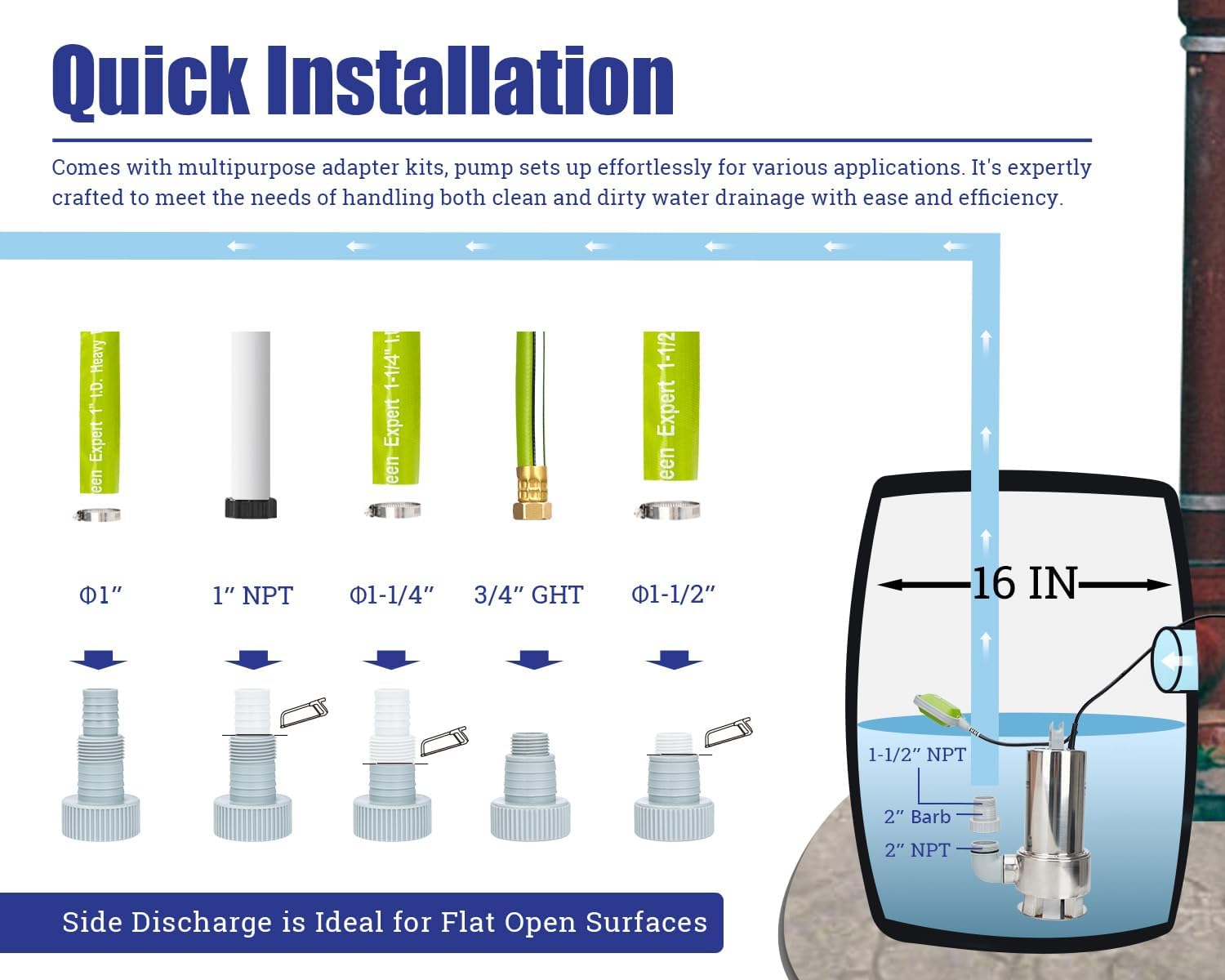- 【Simple to Install with Hoses】Multipurpose adapter kits allow to connect a majority of hoses easily: 1”, 1-1/4", 1-1/2", 2" ID discharge hoses for high capacity pumping; 3/4" GHT, 1-1/2" NPT, 2" NPT connect threaded hoses for quickly installation. *This item is NOT compatible well with expandable hoses that would cause poor flow.