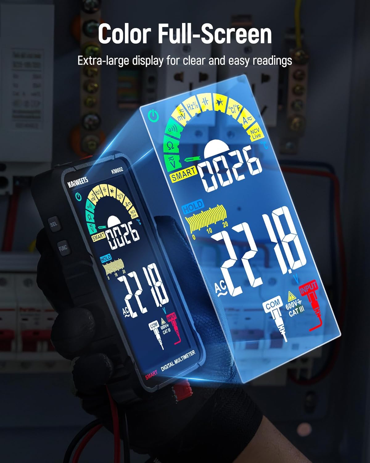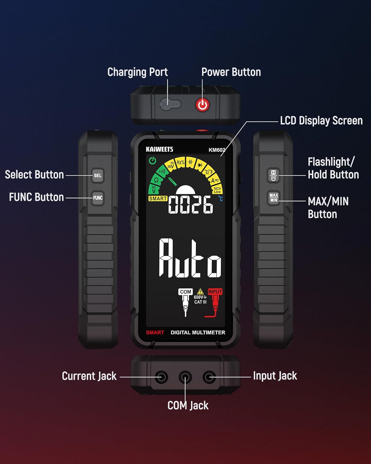- Auto & Manual Mode: The KM602 digital multimeter features a SMART mode that automatically measures voltage, resistance, and continuity. It identifies what you're testing and selects the optimal range for precise and quick measurements. In manual mode, it accurately measures AC/DC voltage, resistance, continuity, current, capacitance, frequency, diodes, duty cycle, temperature, NCV, and live wires