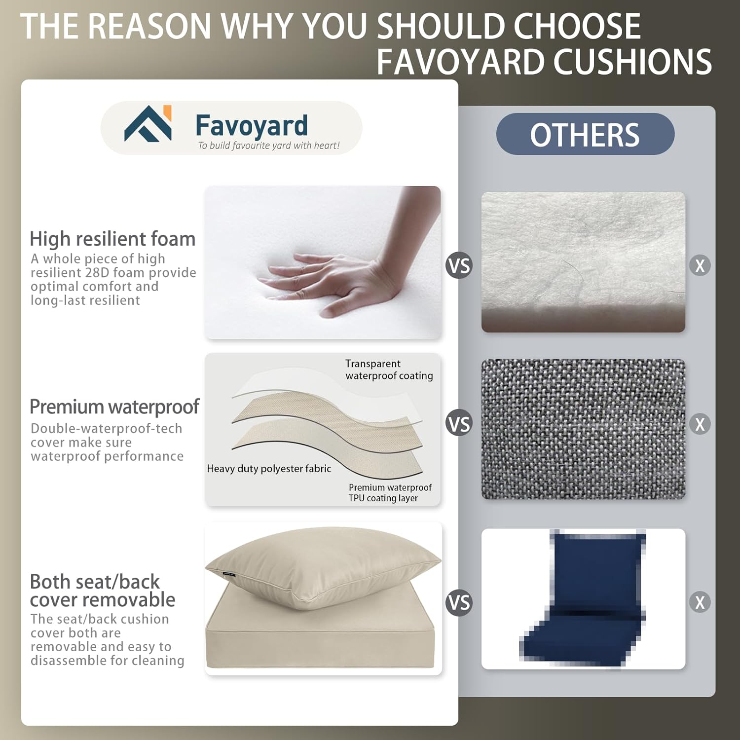 - Double-Waterproof Tech Cushion Cover: Favoyard outdoor cushions for patio furniture choose 300GSM high density polyester fabric for the cover could provide excellent waterproof and dust resistance ability. In addition, there is a TPU coating on the reverse side of the fabric. Both the TPU coating and the fabric are highly waterproof.