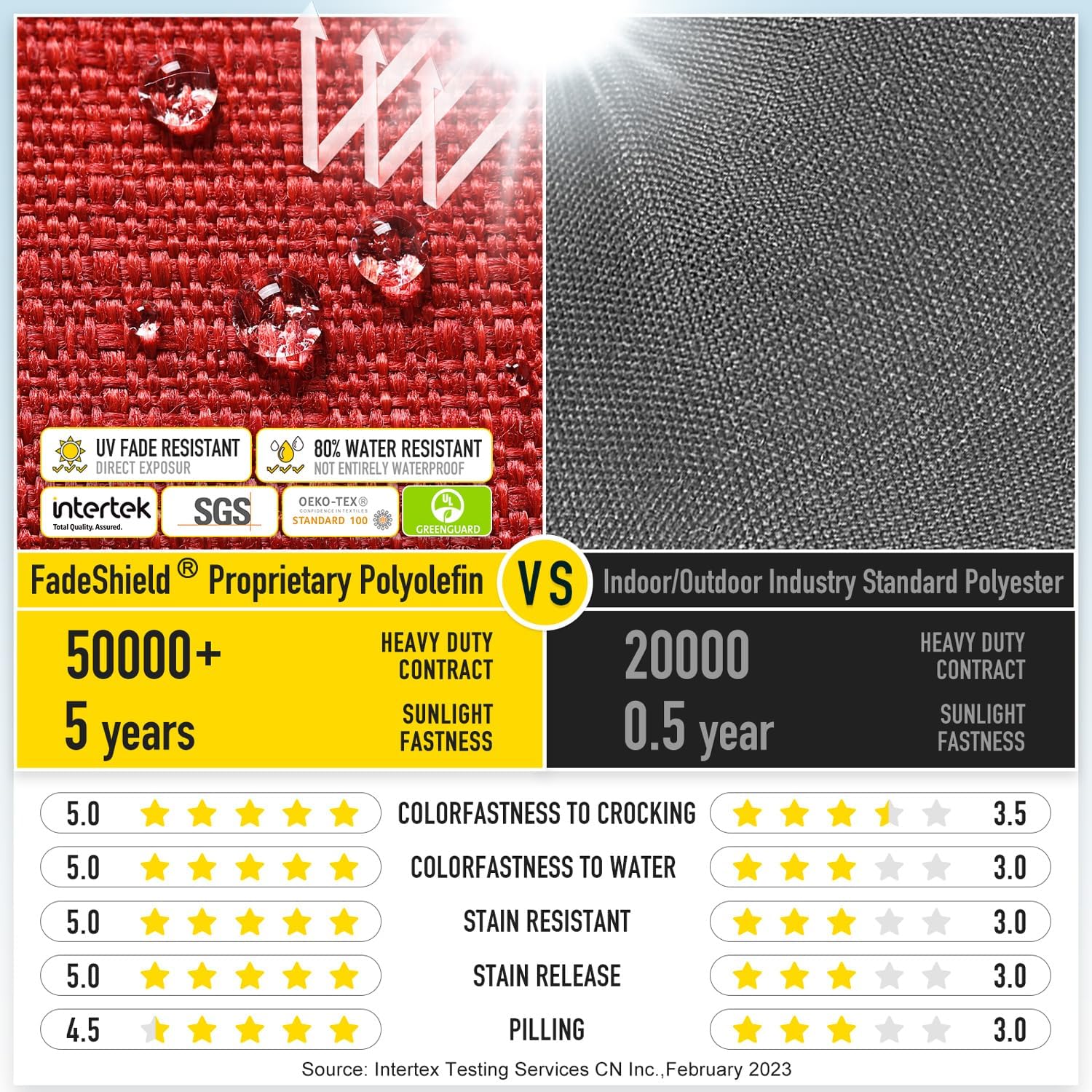 - 【FadeShield - UV Fade Resistant】FadeShield Proprietary Polyolefin are dependable indoor/outdoor performance fabrics, they are infused with antimiсrоbial silver Ion technology and can withstand 5 years of UV fade resistance, solution-dyed to make sure that each color is deeply ingrained in every fiber for continued vibrancy, even after heavy use. We recommend bringing it indoors when it rains or when not in use to preserve its lifespan and keep it looking beautiful.