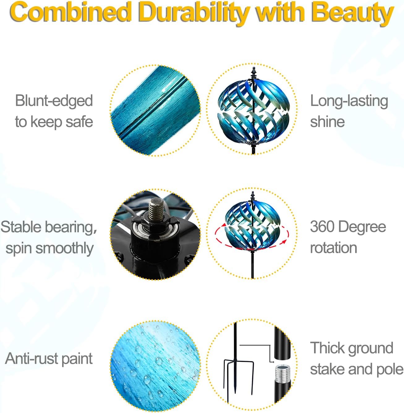 - 【Withstand All Weather】Stable pronged base stake design to keep the outdoor large wind spinner balanced and firmly placed. Hand-painted and UV treated to resist fading, so it is long-lasting and will perfom well as a garden decoration.