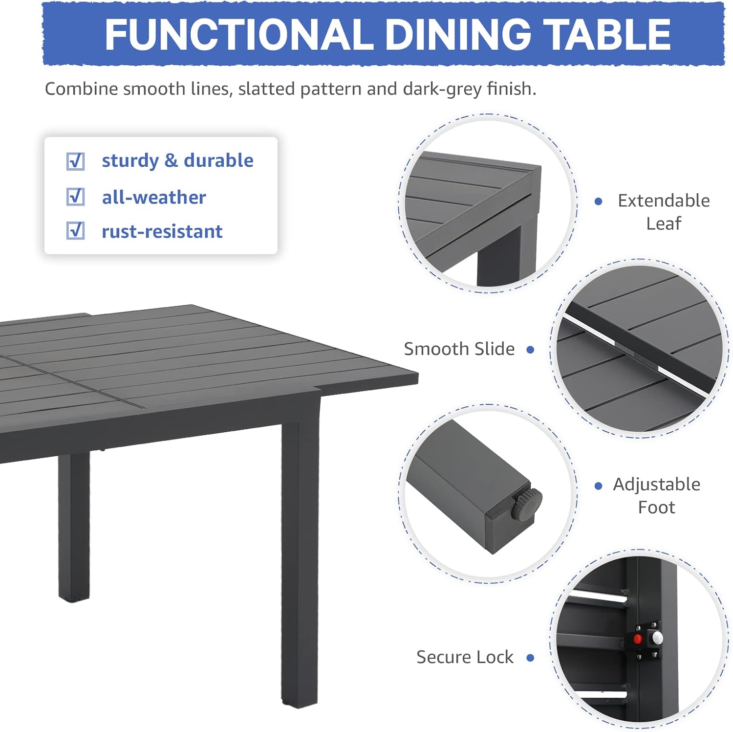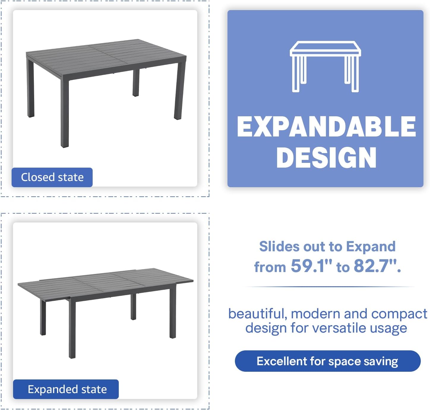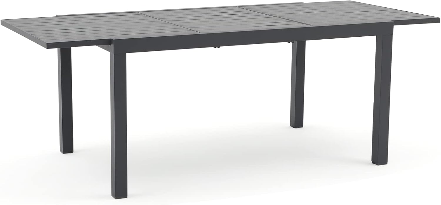- ăMODERN DESIGN & ELEGANT APPEARANCEă: With clean-cut lines, our expandable patio table is the ideal modern accessory for your indoor/outdoor space. Finished with smooth aluminum frames and a slatted design, this outdoor table not only offers a chic, minimalistic look but also provides a stable structure.