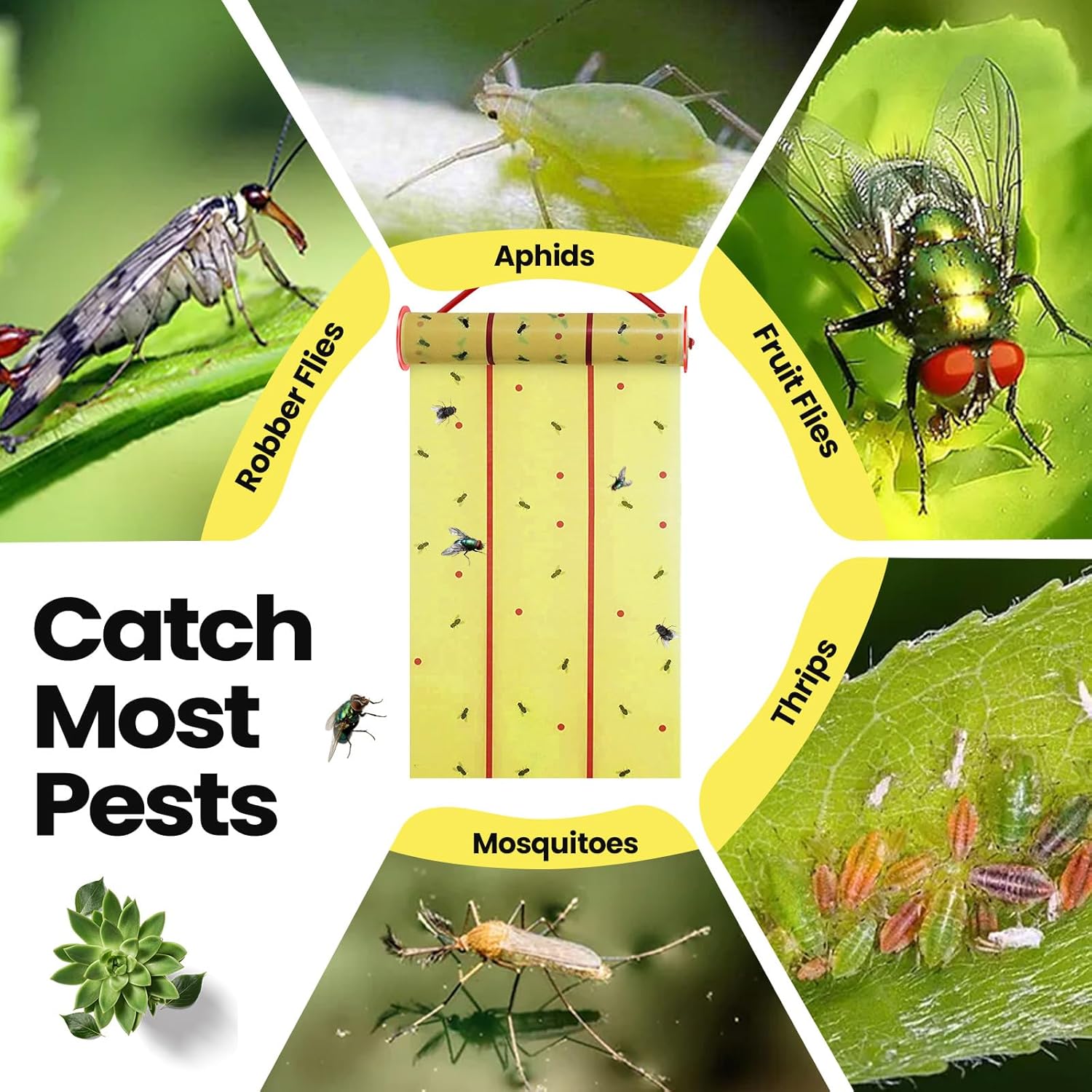 - Total Coverage: the sticky traps for gnats are suitable for different place, such as house, kitchen, yard, farm, horse stable, fruit stand, pantry and any place where annoying flies hover around; The fly paper can stick flies, fruit flies, gnats, aphids, moth, wasp, white flies, black flies, spider, midges, mosquitoes and so on