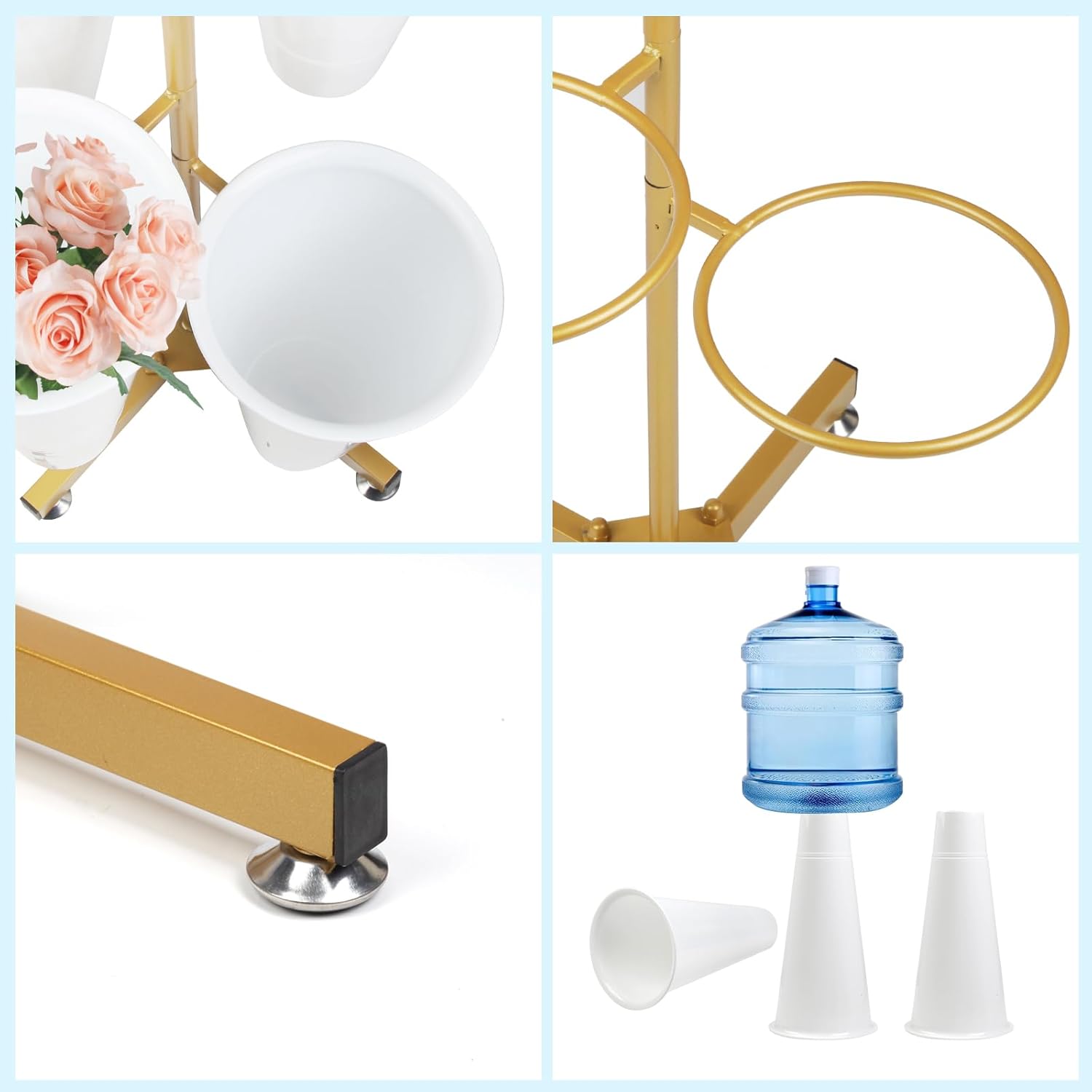 - 【Unique Design】- This flower stand adopts a foldable structure, which is easy to move and store. The frame is made of golden paint through multiple processes such as spraying and baking, so as to form a smooth and bright texture. 4 detachable flower buckets are convenient for you to organize fresh flowers or silk flowers.
