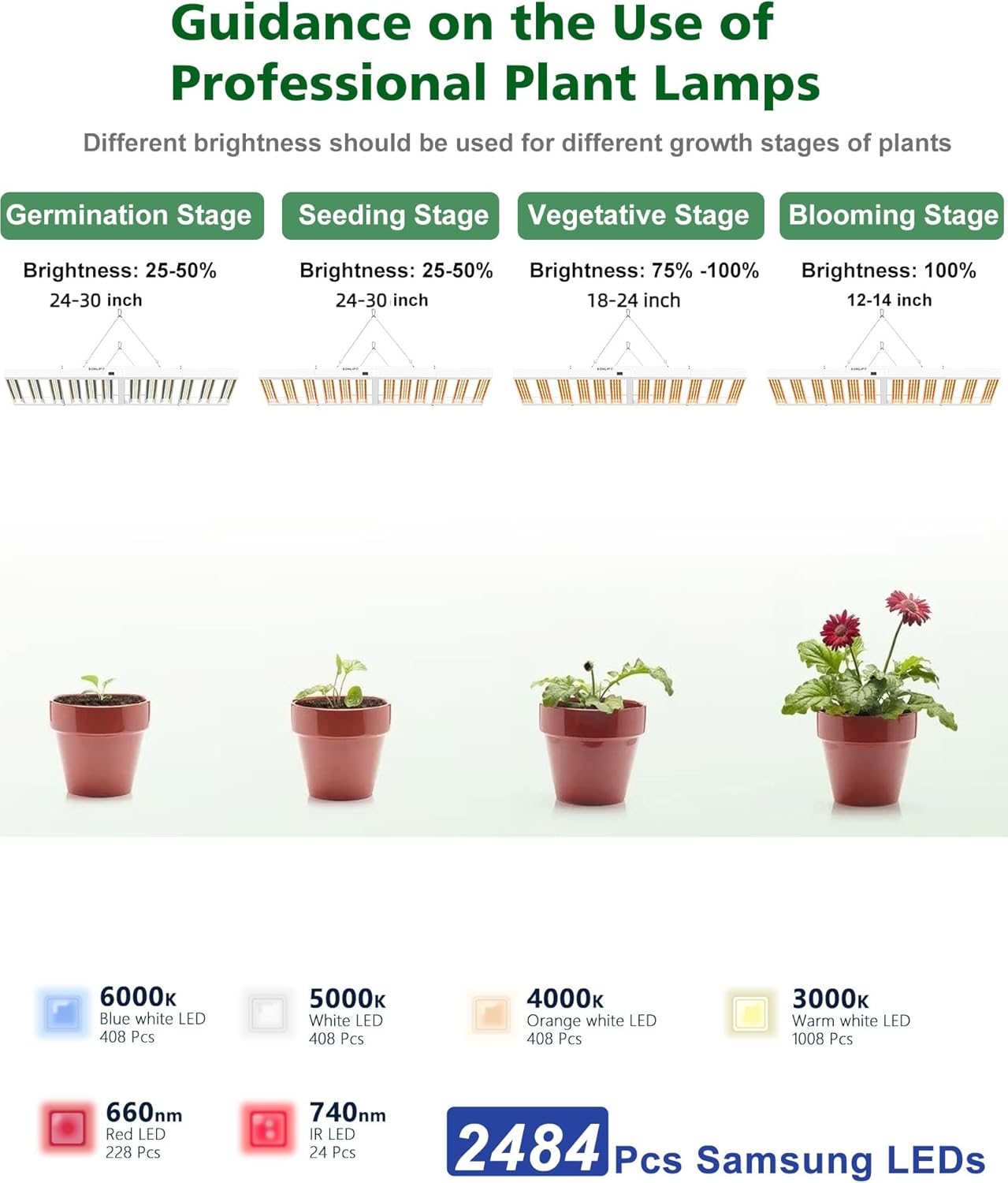 - Dimmer & Timer Functions: Our grow lights consist of 660nm Red light, IR 740nm, and 6000K, 5000K, 4000K, 3000K white light spectrum. The panel dimmers can adjust the intensity of the light, and the growing lamps support timer setting and time reservation function. This helps plants grow healthier. Perfect for 5x5 ft, with max coverage of 6x6 ft.
