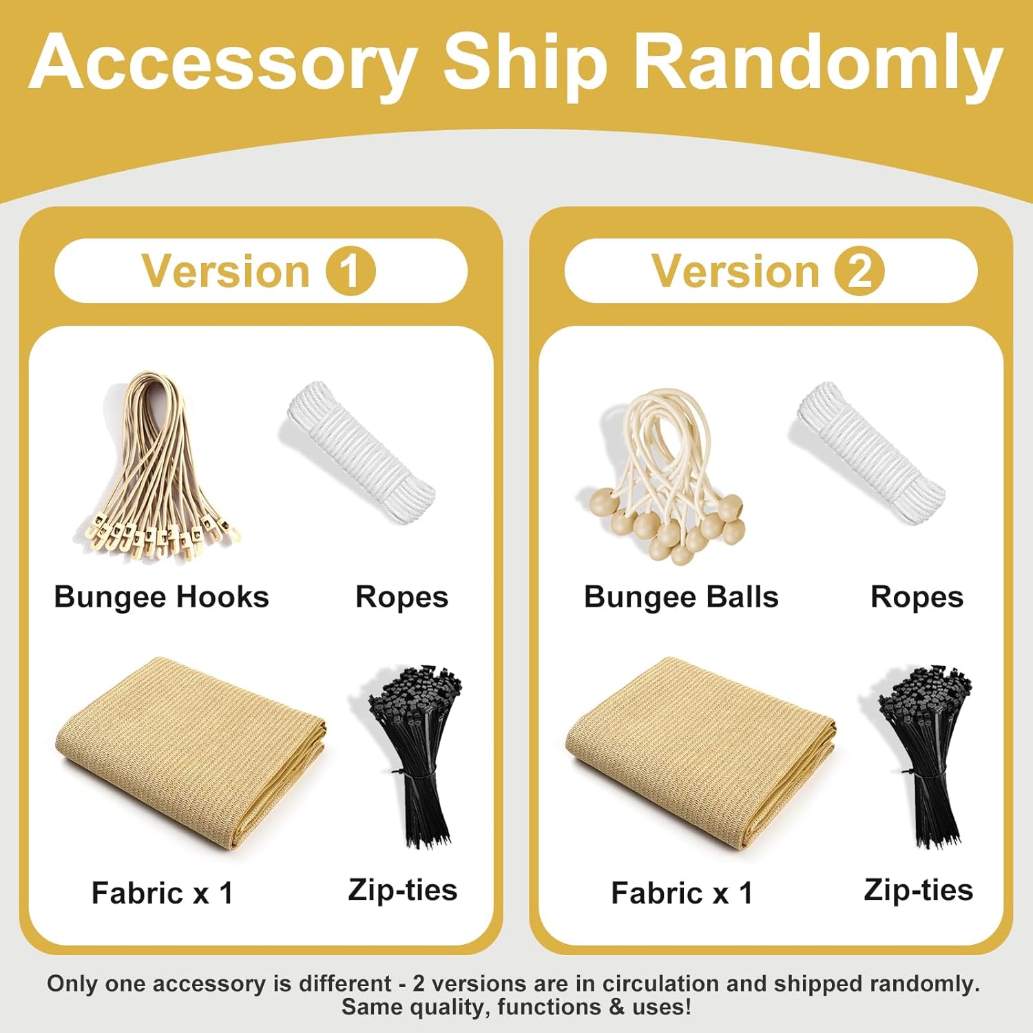 - Accessory Updated: Accessories have been updated from [Zip-ties, Ropes, Bungee Balls] to [Zip-ties, Ropes, Bungee Hooks]. Both versions are in circulation and will be shipped randomly. Easy to Install: With included grommets on each sides every 2 ft space and fixing accessories, you can easily attach the pergola shade cover to various structures while ensuring uniform stress. Whether you're looking to cover your backyard, carport, or playground, you can have it up and providing shade in no time