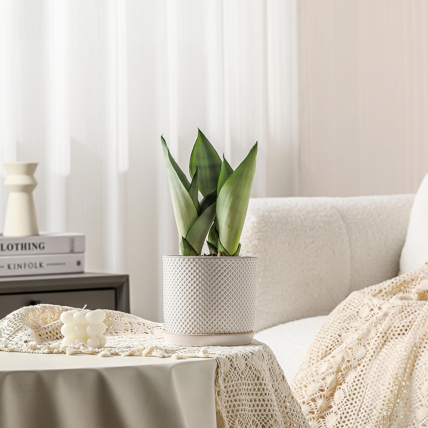 5.8 Inch Plant Pots: Ceramic Planter with Drainage Hole & Saucer - Flowerpot for Indoor & Outdoor Plants - Beaded Embossed Design White - with Separate Tray