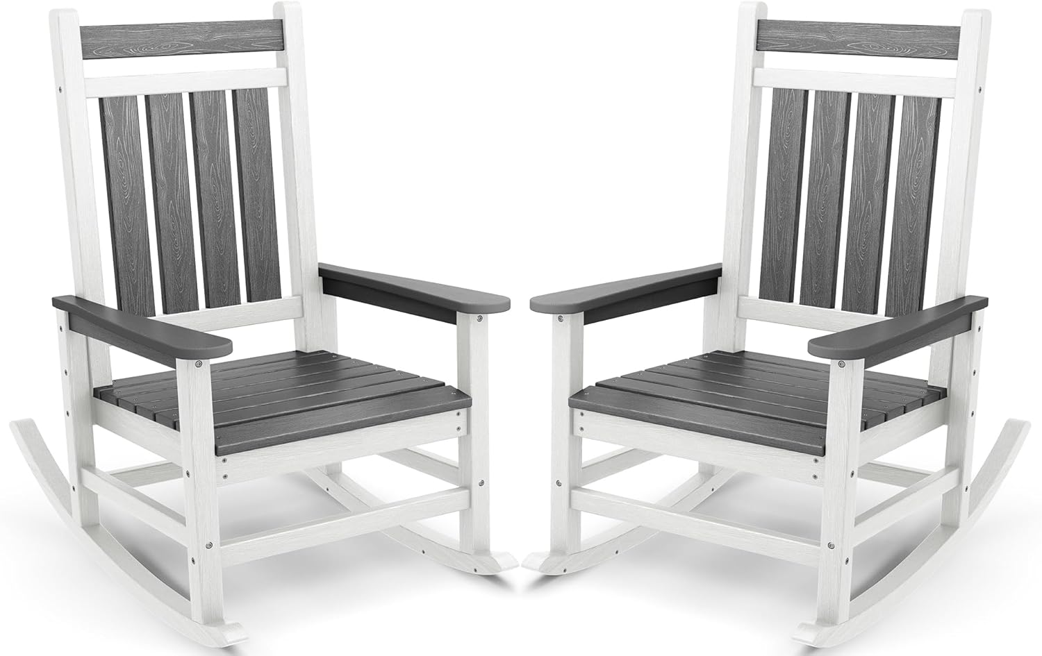 SERWALL Outdoor Rocking Chair Set of 2, HDPE Rocking Chairs for Adult, All Weather Porch Rockers for Lawn Garden, Gray & White