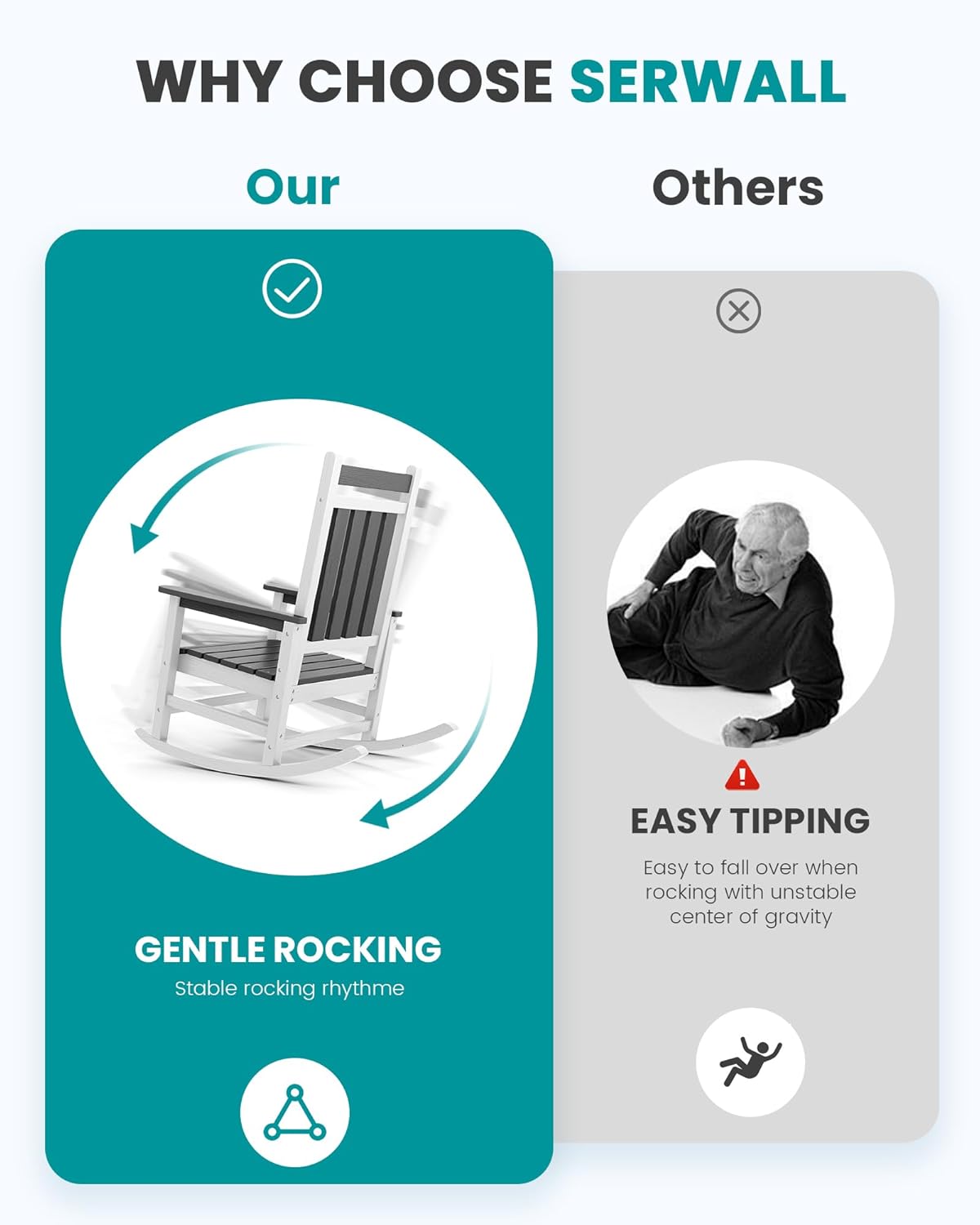 - ăAnti-RolloverăEngineered for stability, our outside rocking chair boasts a 4-point design with crossbars that evenly distribute weight, coupled with a precision-calculated rocking arc for safe, relaxing use.