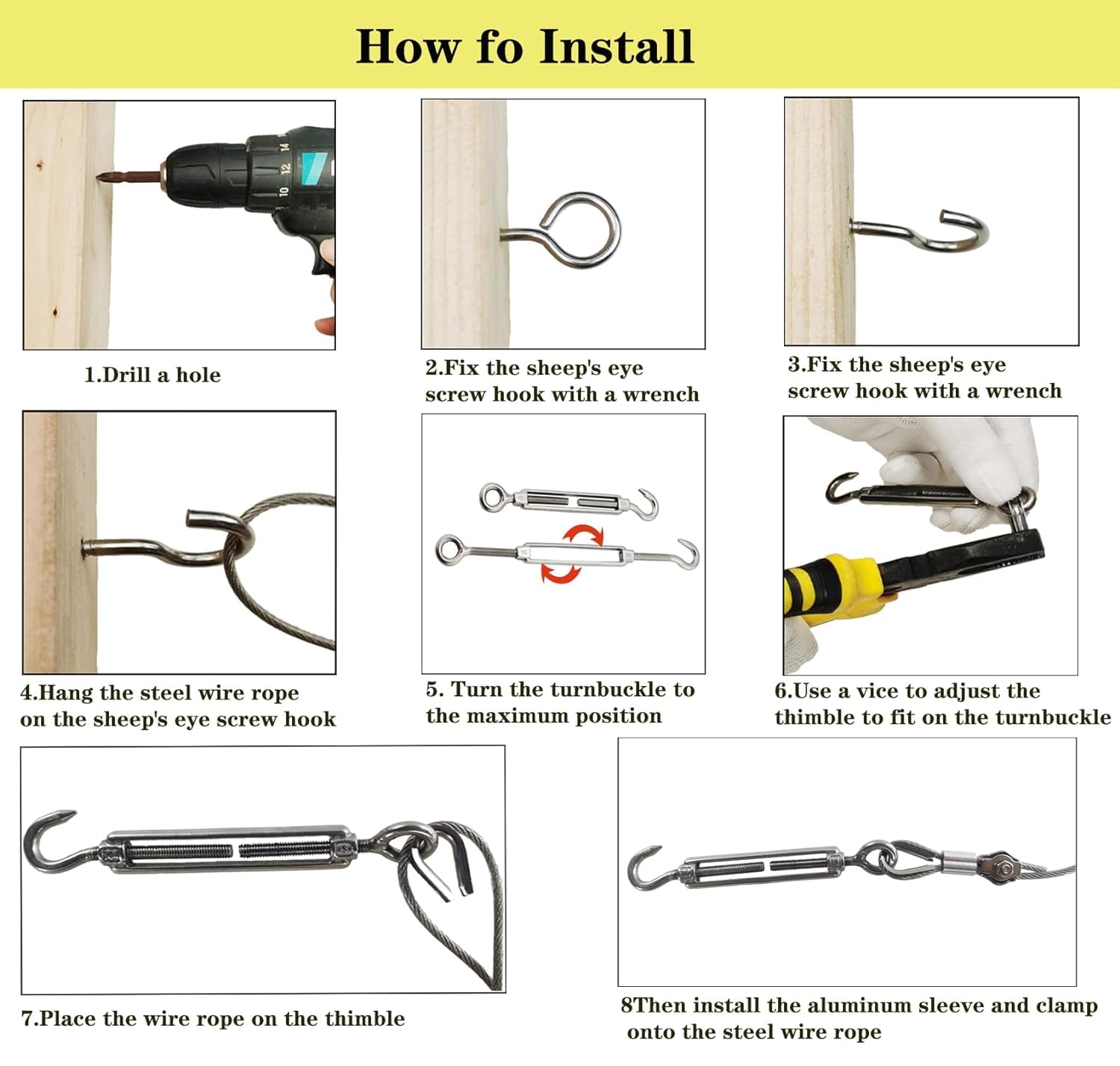 - 【Easy Installation】: This stainless steel cable is very easy to install. It only requires aluminum crimping sleeve tools and cable cutters to complete the deck cable railing. The squeeze turnbuckle tensioner can be adjusted to tighten the wire rope.it a simple task to put up the strings light no matter on wood, timber or concrete wall (Removable and reusable)