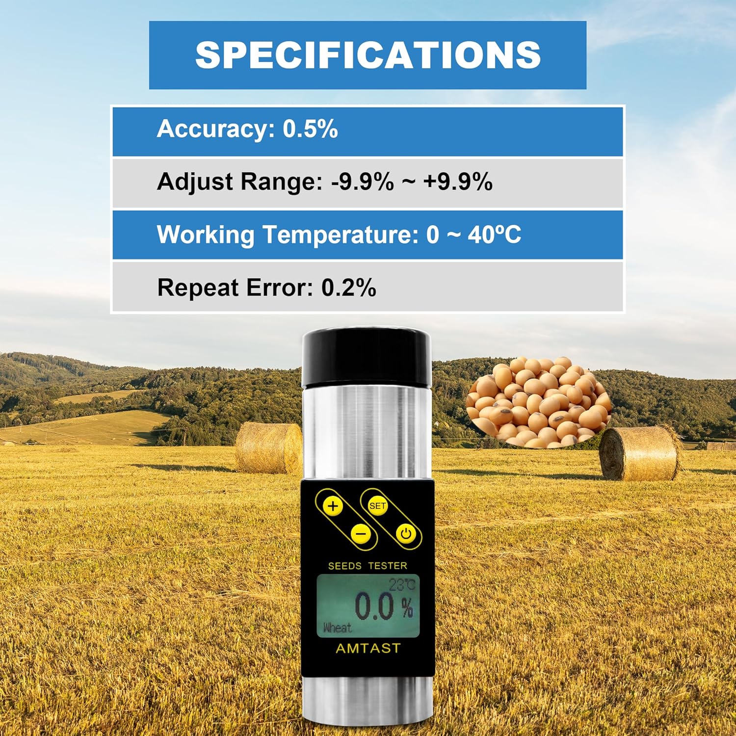 - πππππππππππ πππππ ππππππππππ - The seed moisture tester is designed for easy portability, with a compact, pocket-sized structure that makes it convenient to carry. Whether you're in the field or on the go, it fits comfortably in your pocket or tool bag for quick access. Our moisture tester is made of durable stainless steel, ensuring long-lasting performance and reliability even in harsh field conditions.