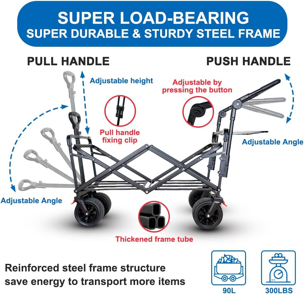- đź›’Foldable Wagon with Big Wheels: The large wide all terrain wheels suit different road surfaces, such as mud, sand, gravel roads,etc. The front wheels can rotate 360 degrees, easy to go ahead and turn around. Also, Pull and push handles are adjustable for different heights of people. Whichever direction you want to go, you'll have no trouble wheeling this cart around.