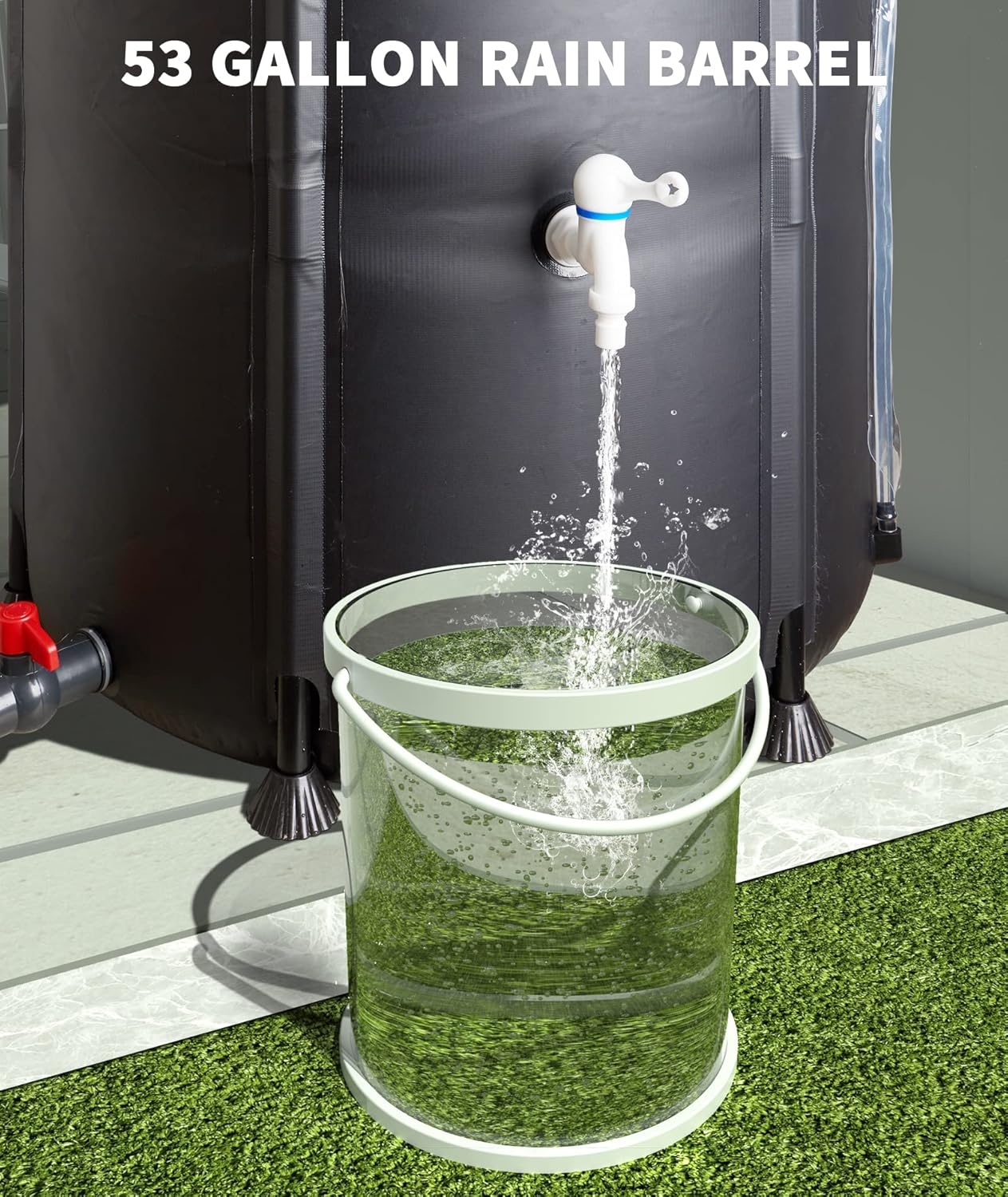 - Portable and Durable: Assembled from 3-ply heavy-duty waterproof fabric, anti-corrosion PVC frame, and anti-leakage rubber rings, this rain barrel system is UV-heat/cold-freeze resistant and offers maximum protection from sun, rain, snow, dust, dirt, and other elements. It can be folded and stored in a garage or utility room, taking up minimal space and allowing for easy transportation