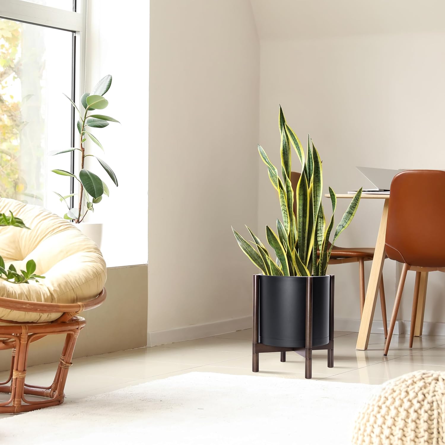 D'vine Dev Planter Pot with Stand - 14 Inch Plastic Cylinder Flower Pot with Wood Planter Holder for Indoor, Matte Black Pot + Walnut Color Stand, 55-C-R-2