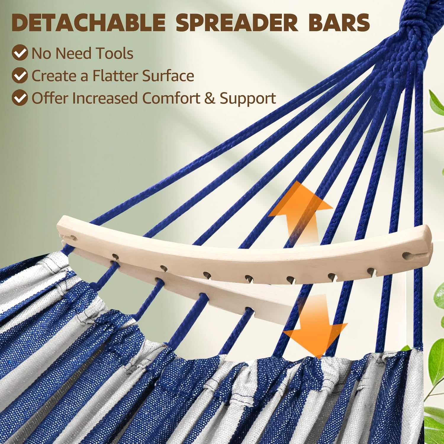 - Stability and Security:The spreader bars enhance stability, preventing excessive swaying or flipping,ensuring a secure and safe experience,especially when entering or exiting the hammock. With the included suspension system comprising two infinitely adjustable straps and two carabiners, you can easily and securely set up the hammock,promoting safe and enjoyable lounging.The suspension system's carabiners further enhance safety by offering reliable and secure attachment points.