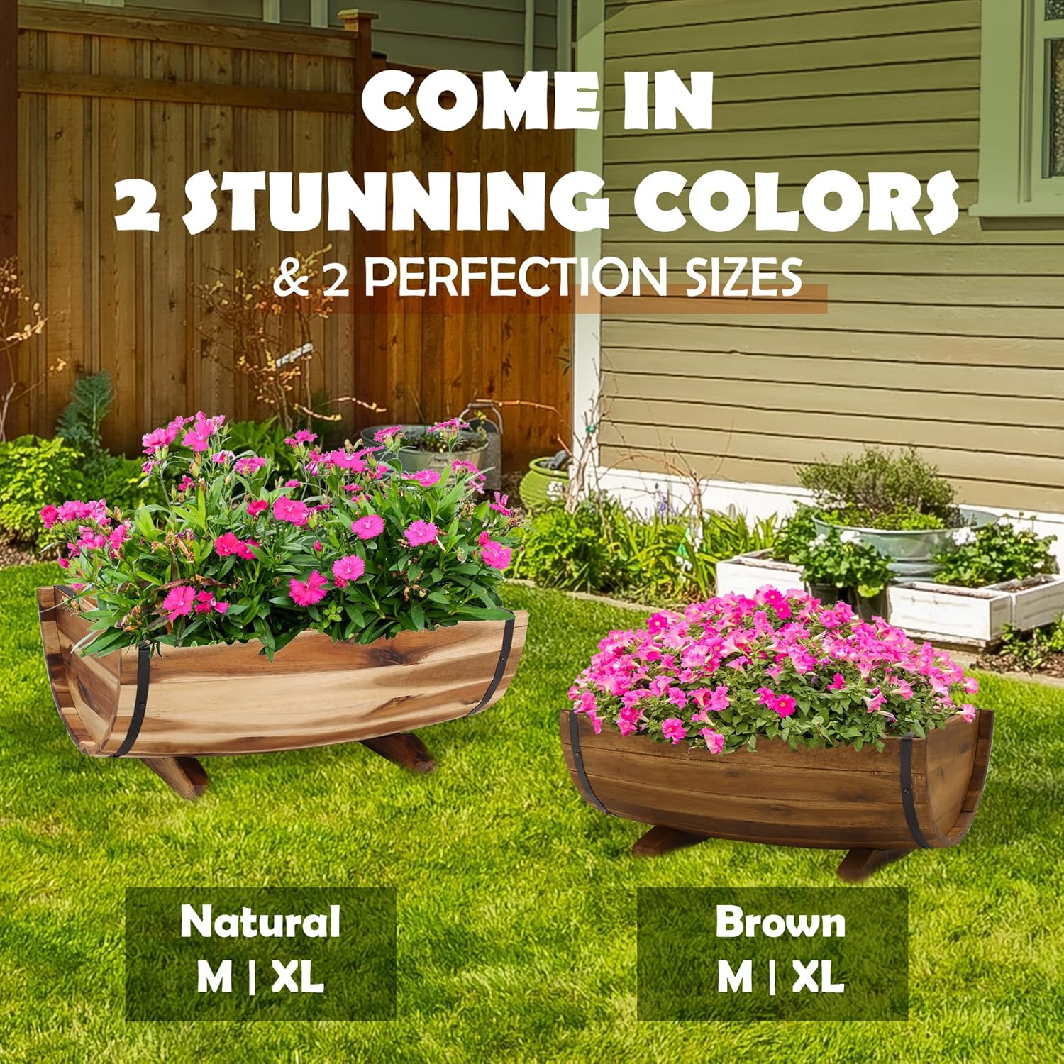 IDZO Solid Acacia Wood Half Barrel Planters Outdoor Set of 2 Different Sizes, Wooden Planters for Outdoor Plants with Metal Bands & Drainage Holes, Legs Included, Natural