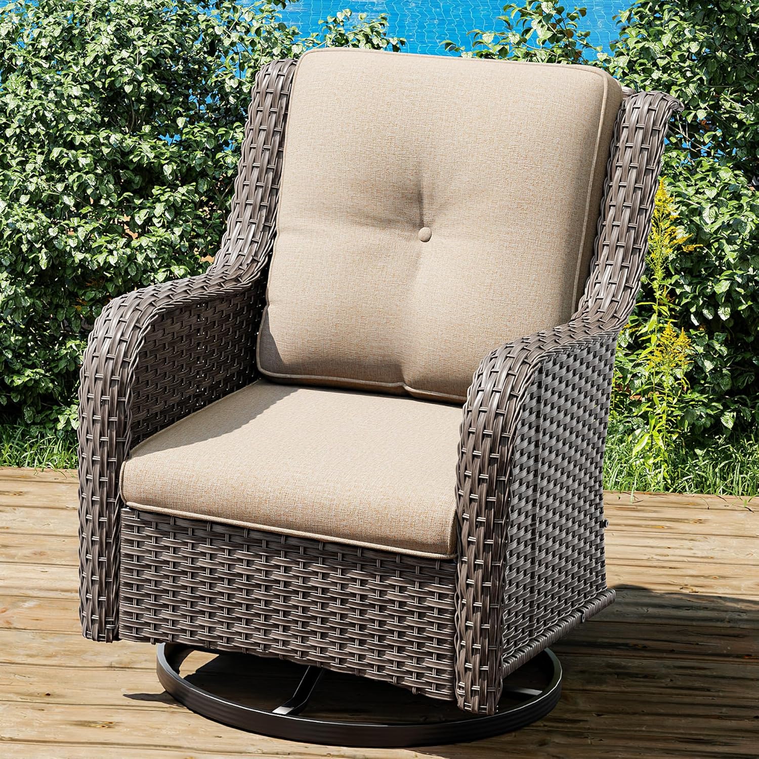 - Ergonomic Structure: This wicker swivel patio chairs have comfortable streamlined seats, ergonomically designed backrests and widened armrests which can provide the utmost comfort. The thick and soft back & seat cushions make you feel more comfortable to sit on and enjoy your patio leisure time