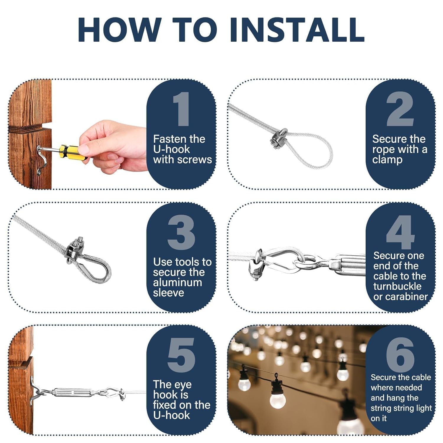 - Multipurpose Teniosner Wire Kit: The 3/16 cable tensioner kit is ideal for a variety of heavy-duty suspension applications, including string light hanging kit, garden wire system, wire curtain hanging system, chain link fence tensioning, cable railing kit, clotheslines, anti sag gate kit, fence wire, or building DIY railings, shade sails, and more (plastic anchors are suitable for concrete/brick walls)