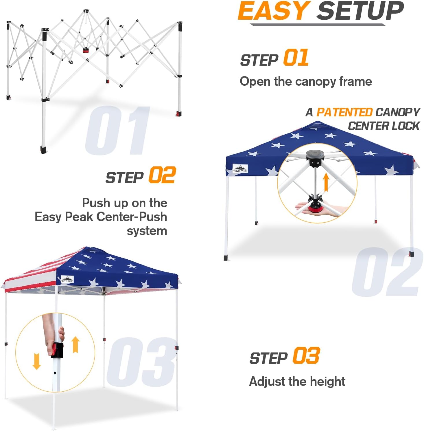 - EASY SETUP: This easy setup pop up canopy tent features the Peak Push system, a patented canopy center lock. The portable canopy requires no tools and easily opens and closes from the center in seconds. Its unique canopy tent center lock enables a quick, one person setup, letting you maximize outdoor time with minimal effort