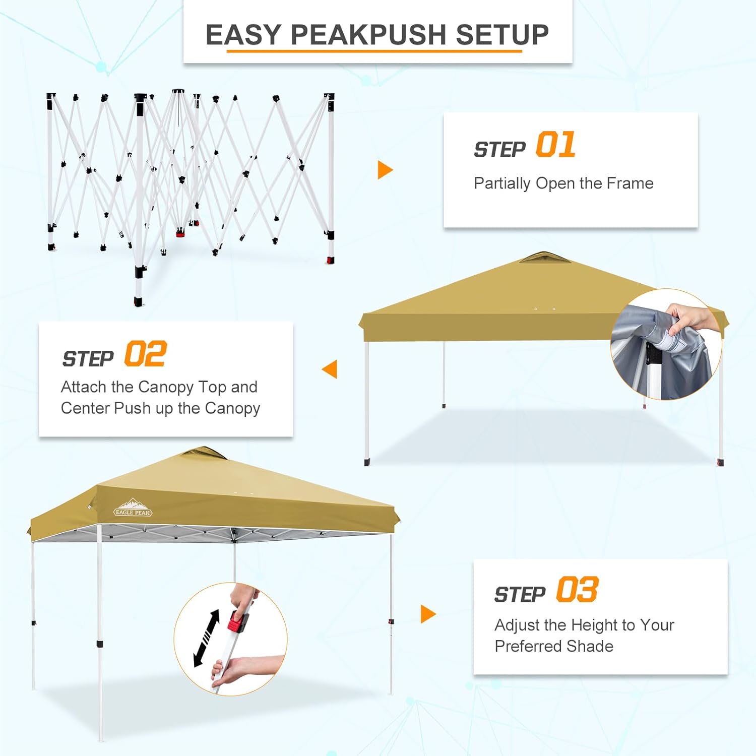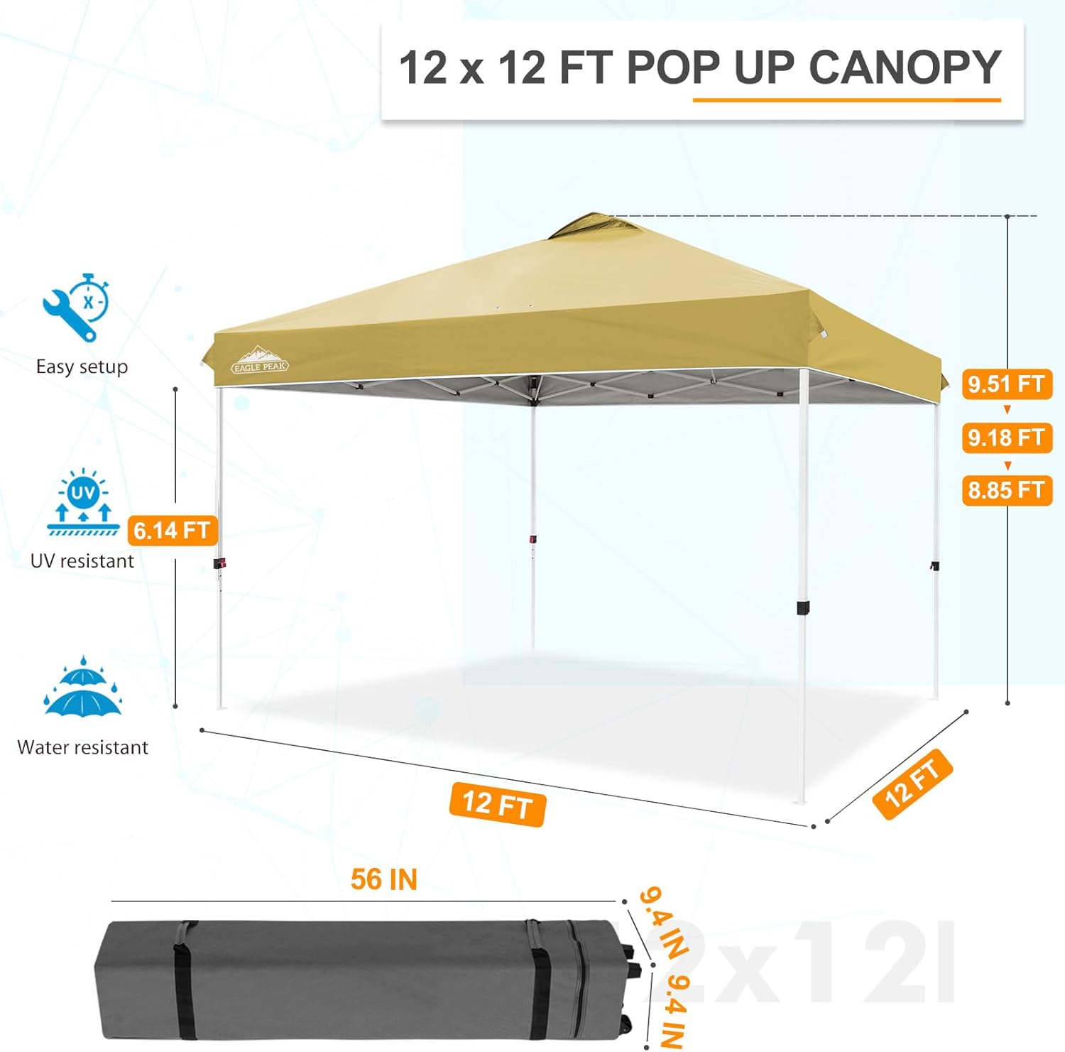 EAGLE PEAK Pop Up Canopy Tent with Wheeled Carry Bag, 8 Stakes, 4 Ropes, 4 Weight Bags, Easy Set Up Tent Canopy, 12x12 ft, 144sqft of Shade, Beige