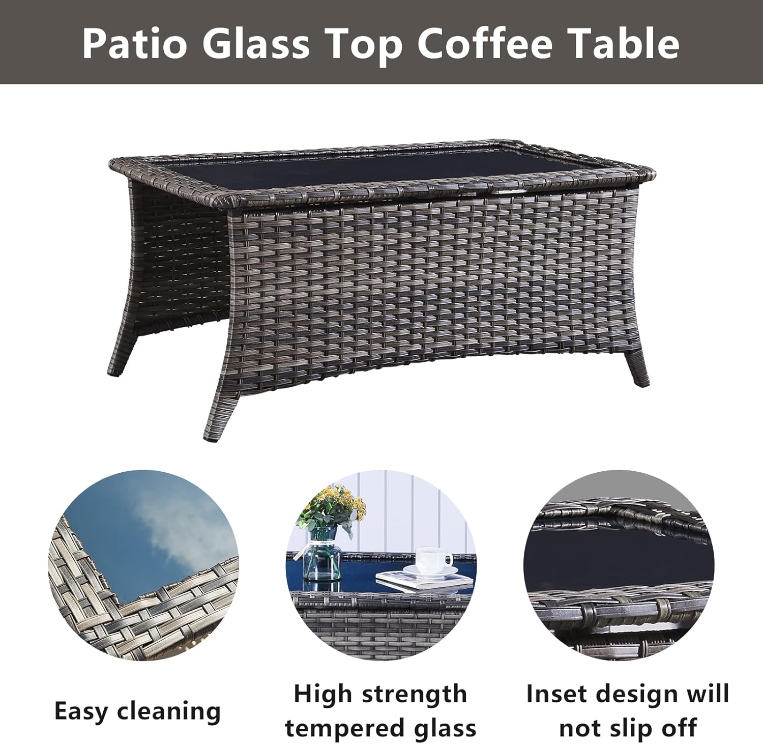 - ă13 PC Patio Furniture Setă The 13-piece patio furniture set includes 4 outdoor swivel glider chairs, 2 outdoor wicker ottomans, 2 outdoor wicker sofas, 1 glass top coffee table and 4 side tables, patio ottoman can not only be used to relax your legs, but also can be used as a small table or small stool. The oversized wicker swivel chairs can hold up to 350 pounds.