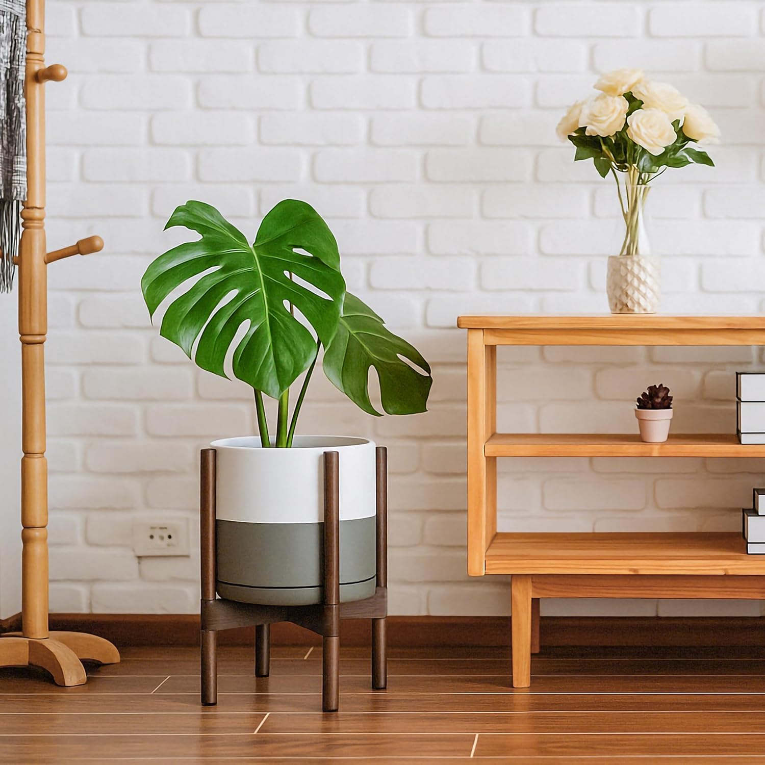 - A Complete Set: Mid-century ceramic planter, combined with a sculptural, solid wood stand that match perfectly together and looks great in anywhere.
