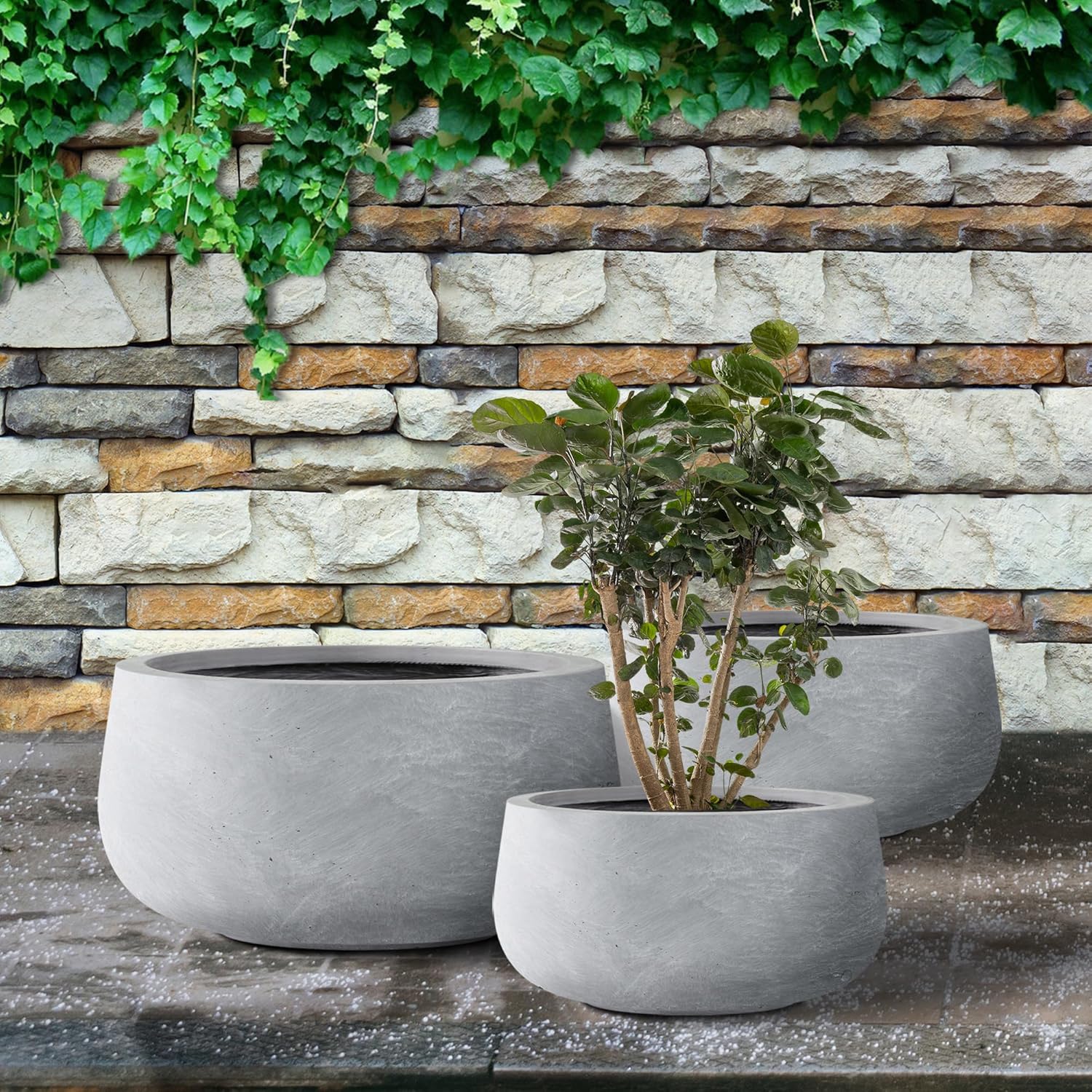 Kante 19.6",15.7",11.8" Dia Round Concrete Planters Set of 3, Cement Plant Pots with Drainage Hole and Rubber Plug for Outdoor Indoor Garden Home, Modern Curvaceous Design, Gray