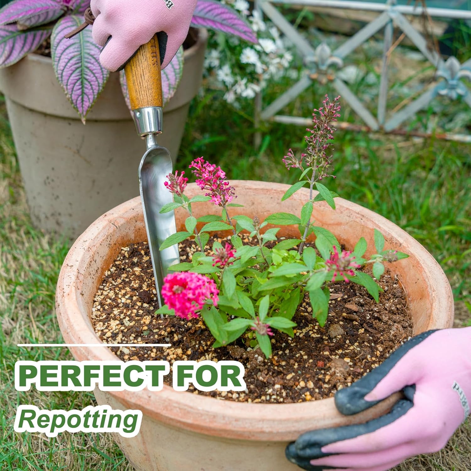 - 【Sturdy and Durable】The plant trowel is made of thicker stainless steel, which is highly compressive corrosion resistant, and more durable, meaning it doesn’t bend like cheaper trowels when you use it to dig, The Comfortable solid wood handle is ergonomically streamlined to fit the natural shape of the hand when holding and using it, helping to relieve strain on the arms and hands, even for prolonged use without tiring your hands.