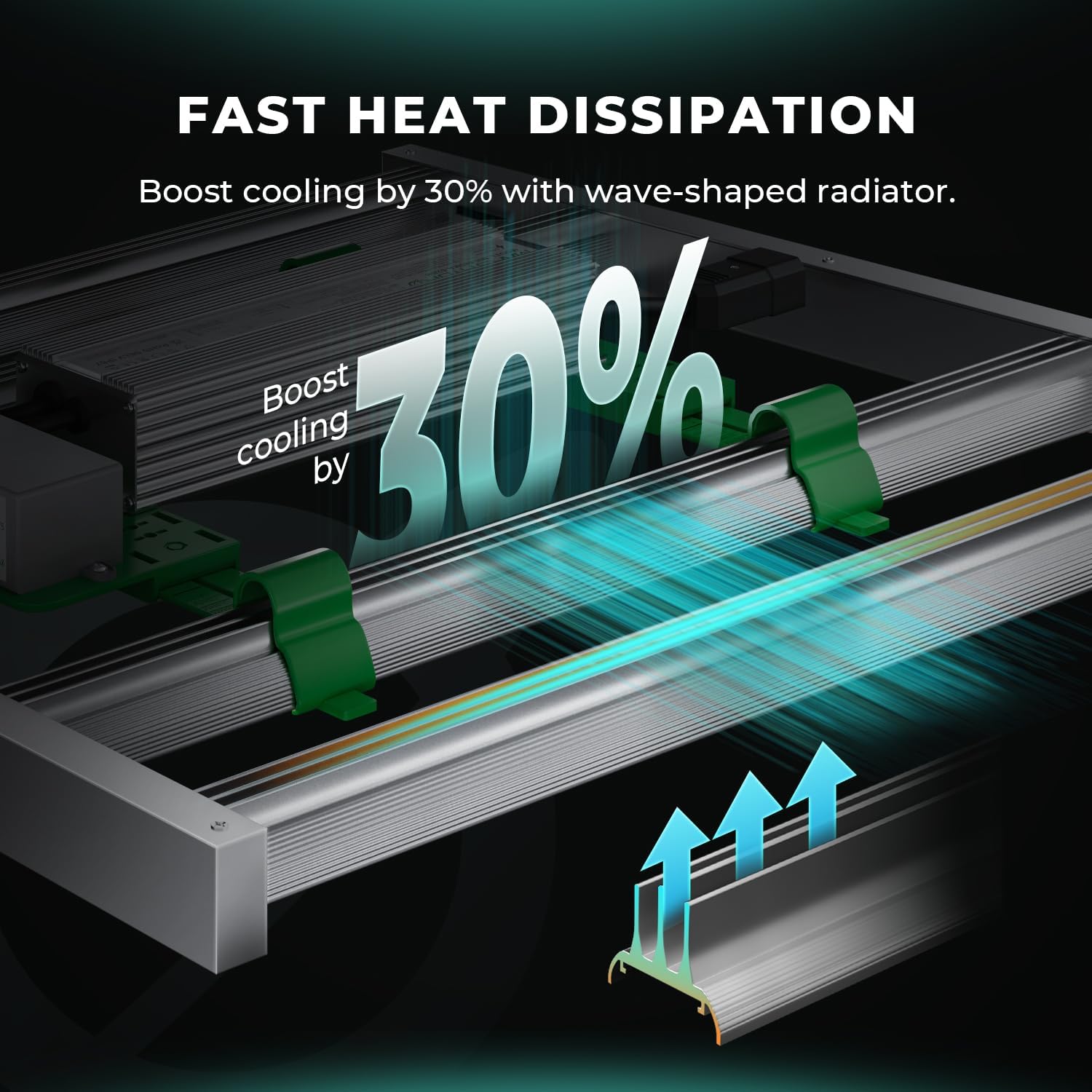 - OPTIMAL HEAT DISSIPATION DESIGN: The wave-shaped heat sink ensures rapid heat dissipation, keeping your growing space at the perfect temperature. With 3.28 ft long power cord, you have the flexibility to position the driver outside your grow tent, effectively reducing the heat emitted by the fixture. The bar-style design results in even light distribution that promotes uniform plant growth while avoiding hotspots in the center.