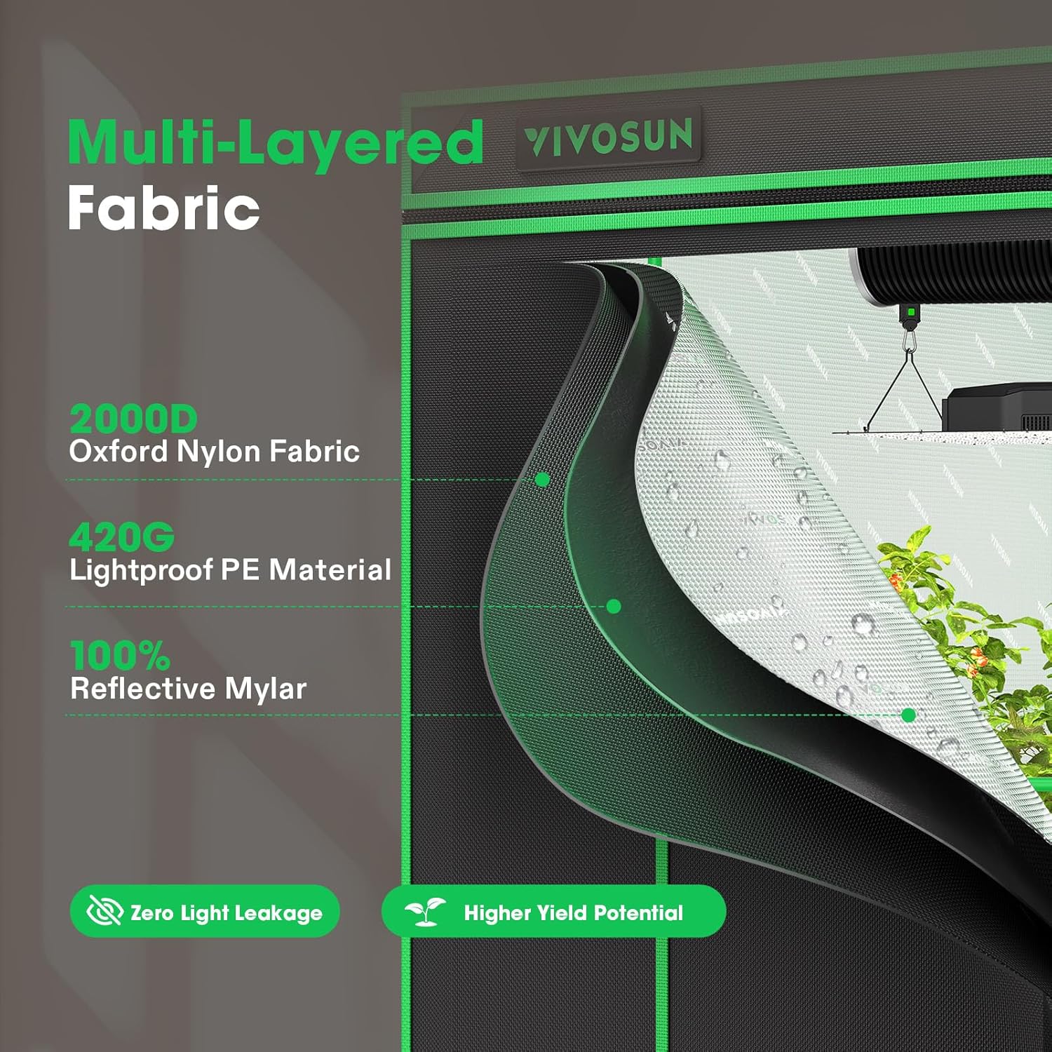 - Upgraded Lightproof Fabric: Durable 2000D Oxford canvas lined with plant-friendly PE and 100%-reflective Mylar; The three-layer thick fabric ensures zero light leaks, boosting the output efficiency of your setup; Zipper section is designed with black inner lining for enhanced light prevention