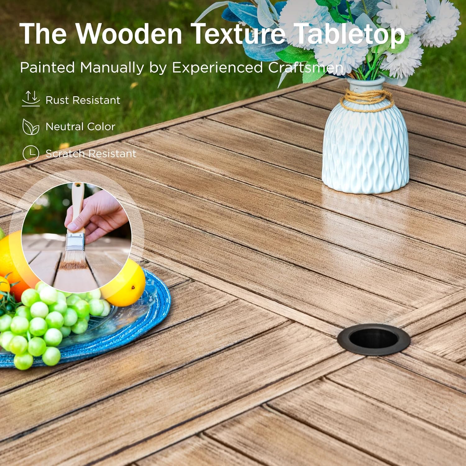 - High Quality Material: Crafted from top-tier metal and fortified with sheet steel, this patio table embodies the perfect blend of strength and elegance. And the metal patio table is enhanced with an advanced e-coating finish. This protective layer not only adds a sleek look but also shields the table from the elements, making it exceptionally resilient against outdoor conditions.