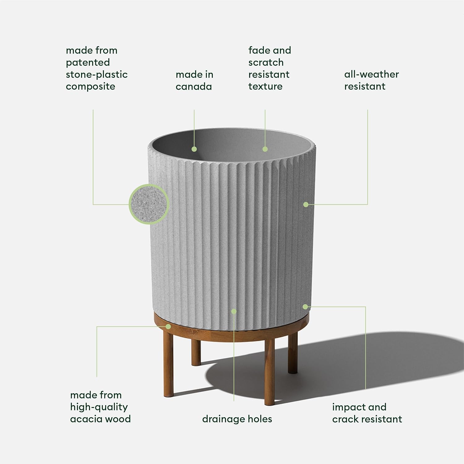 - Material : Plastic-stone composite planter & Acaia wood stand