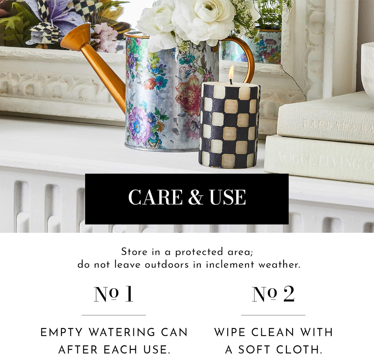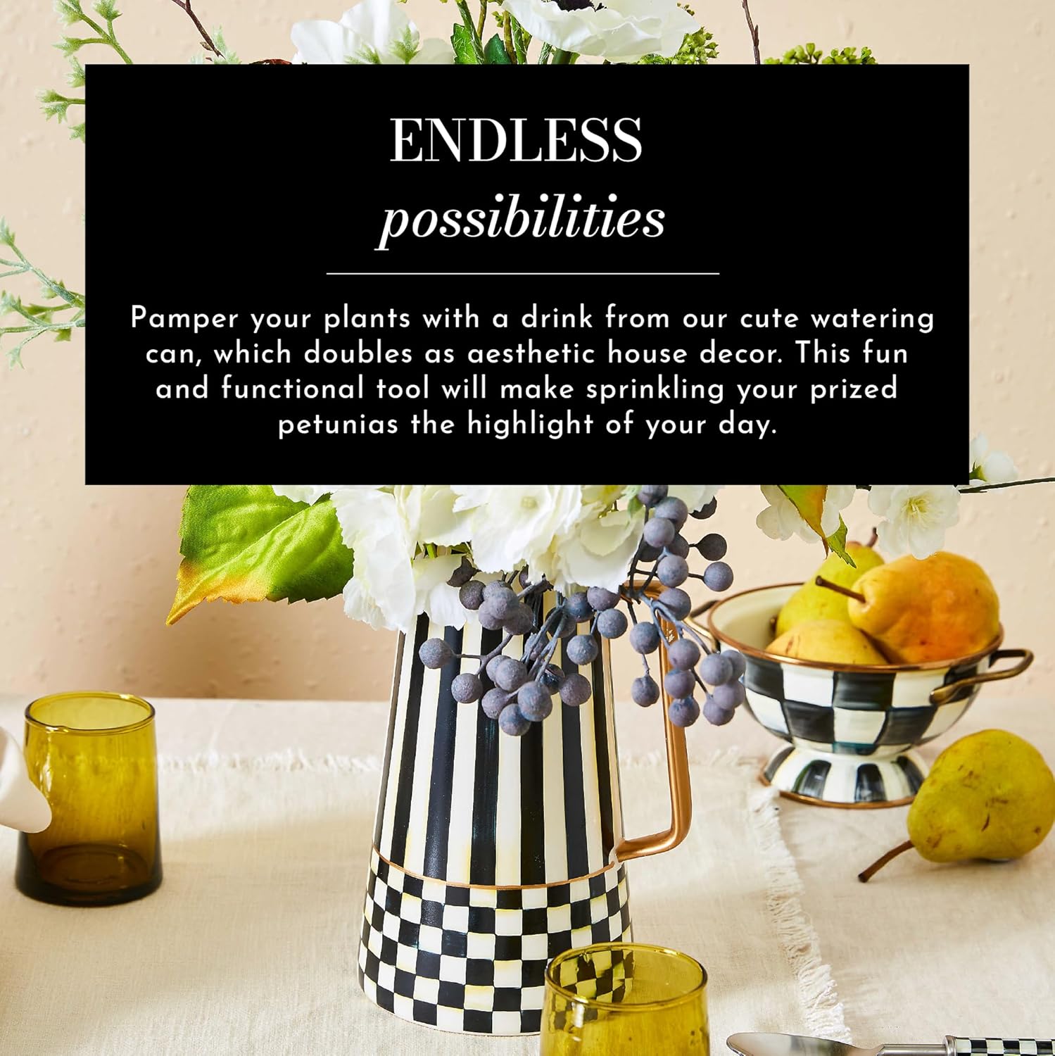- ELEGANT OUTDOOR GARDENING TOOL: Our Spectator rustic watering can features black-and-white color-dragged checks with a long pour spout and handle. The pattern creates classic charm to complement a variety of decor.